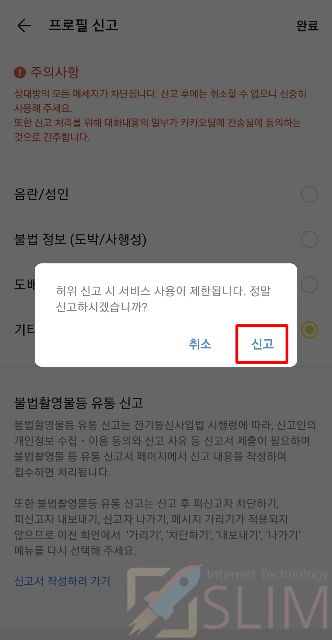 카카오톡 오픈채팅 신고를 허위로 한 경우 신고자의 계정이 사용 제한될 수 있으니 심사숙고하셔서 신고버튼을 누르시길 바랍니다.