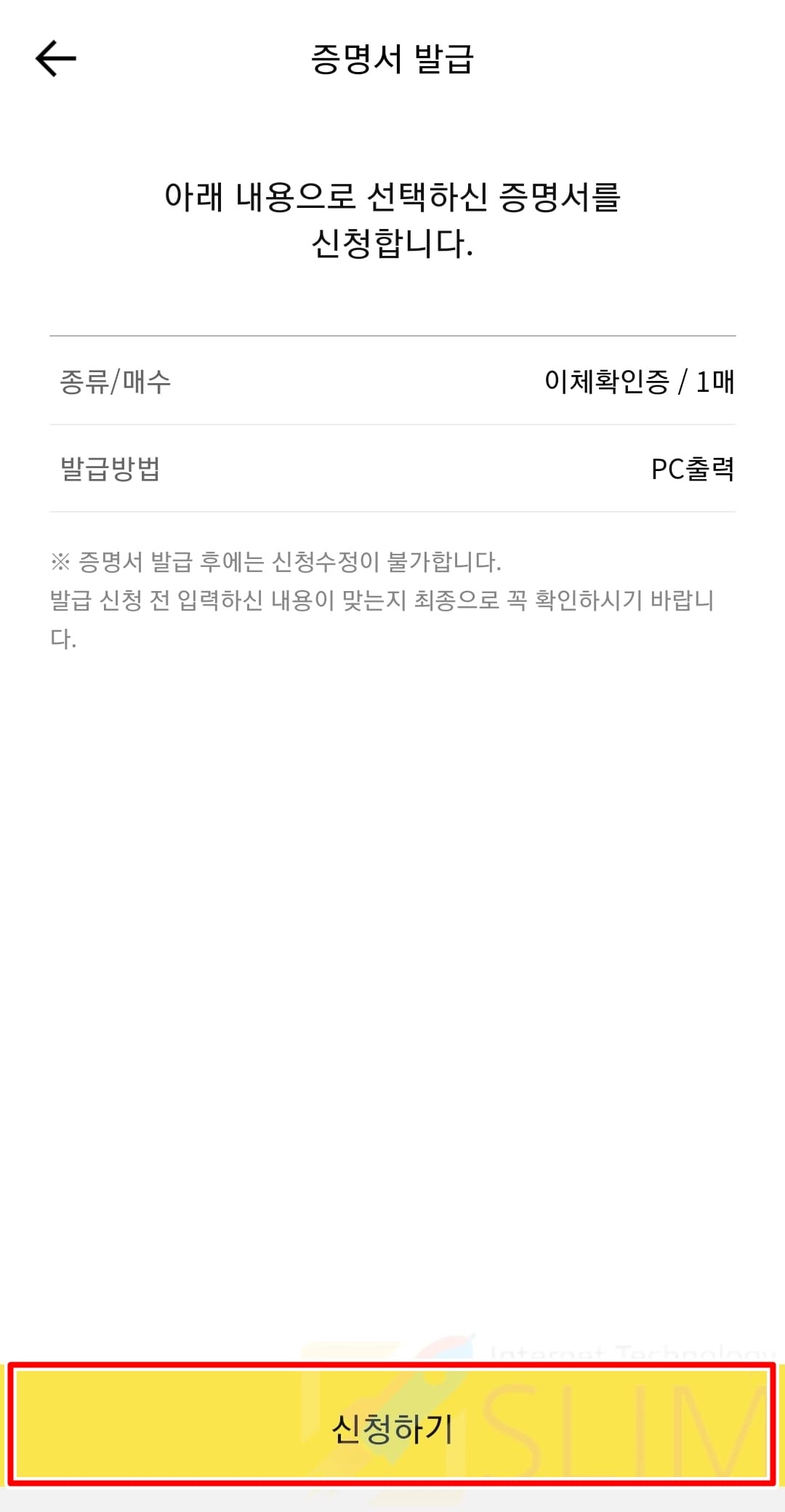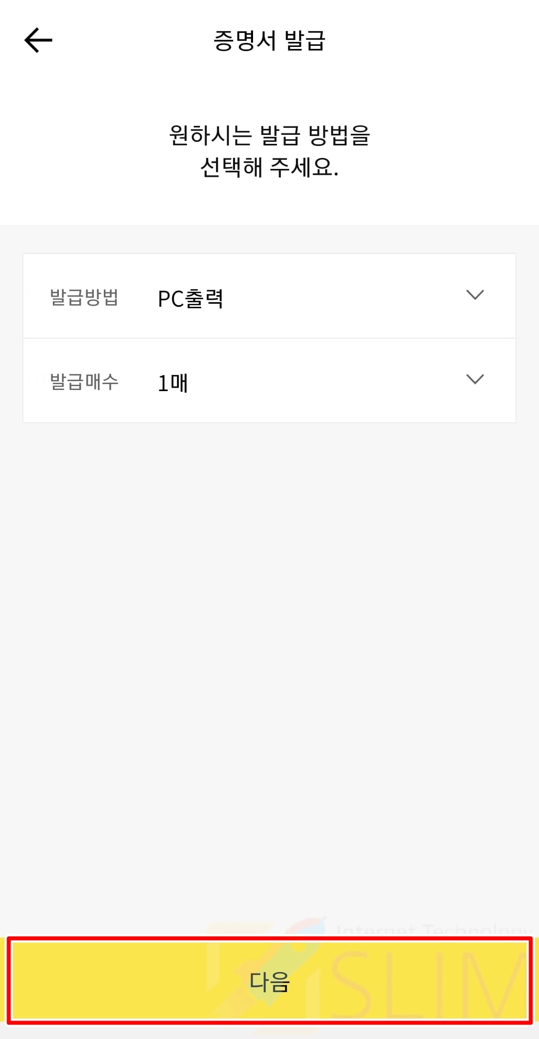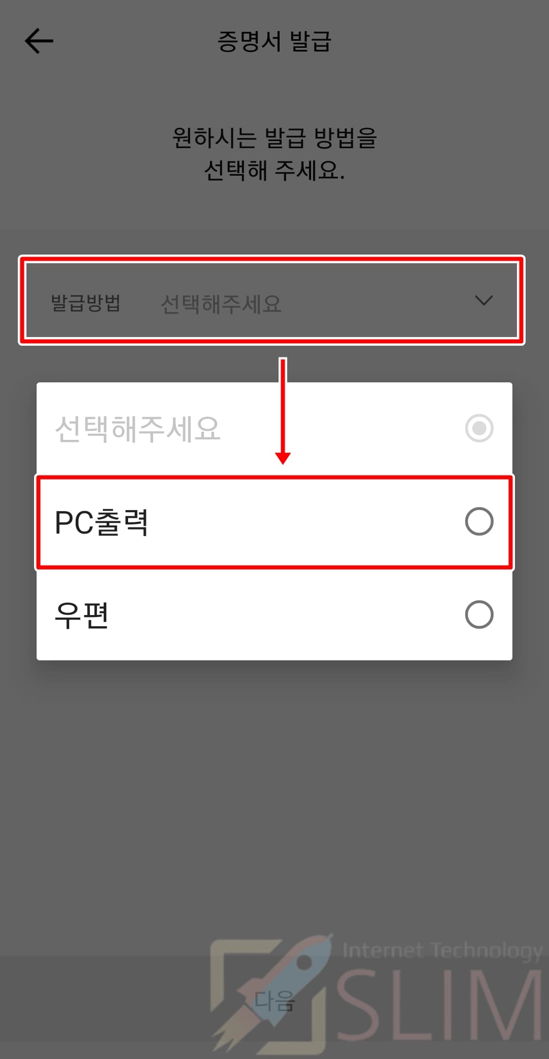 8. 발급 방법을 클릭하고 PC출력을 선택합니다.