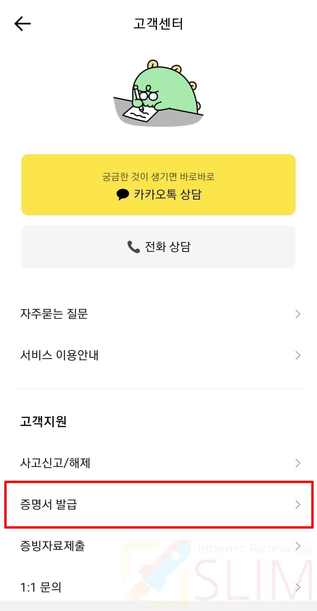4. 고객지원 아래의 증명서 발급을 누릅니다.