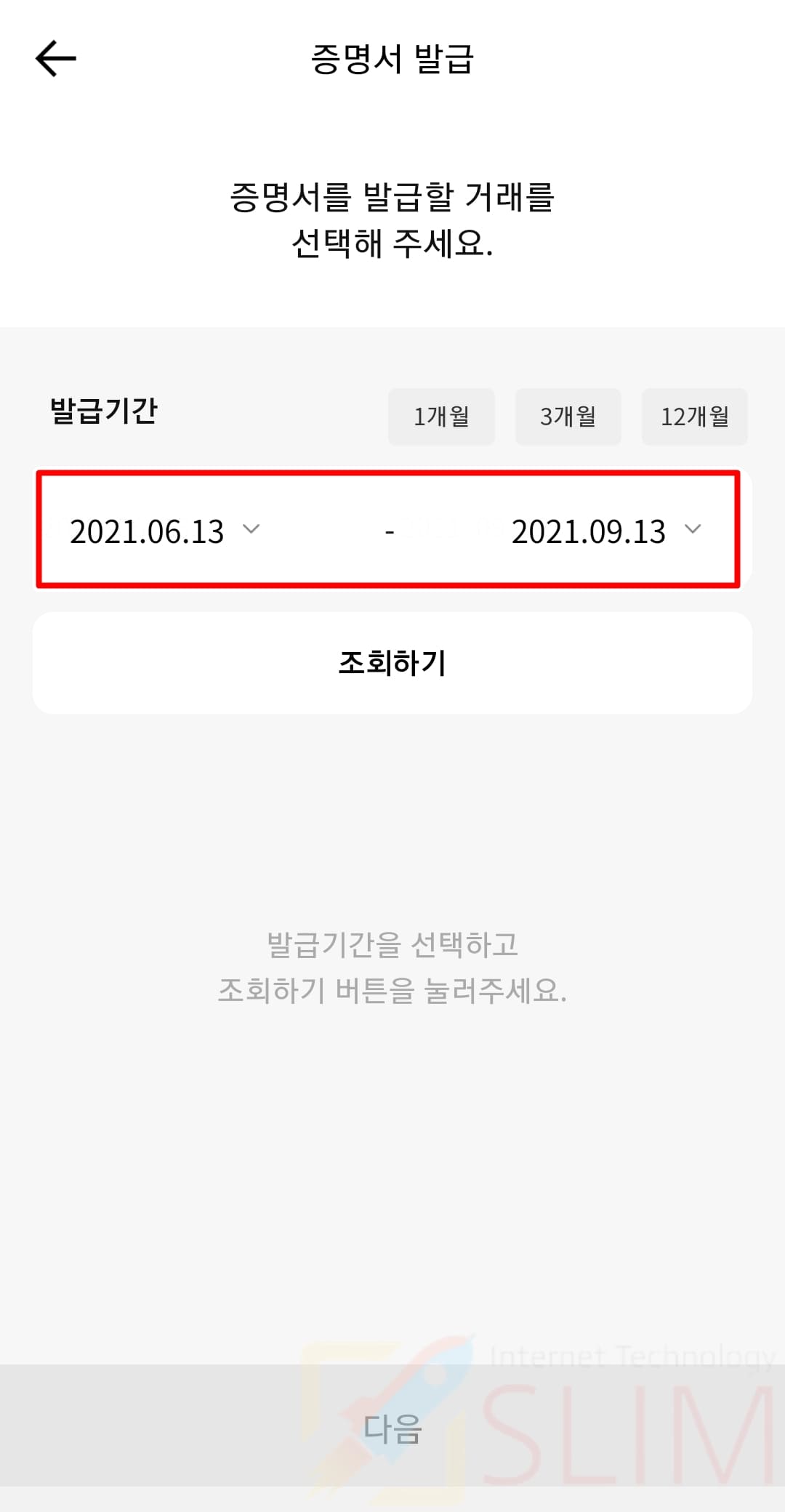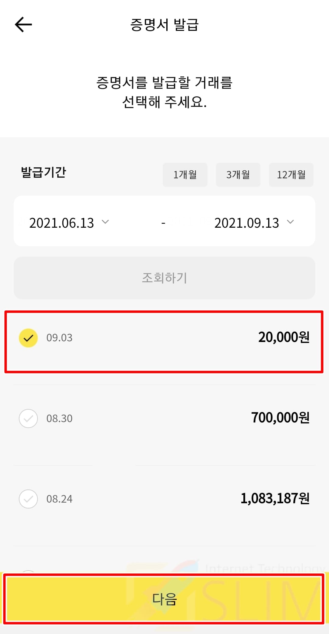 12. 이체확인증으로 보고 싶은 내역을 선택한 후 다음을 클릭합니다.