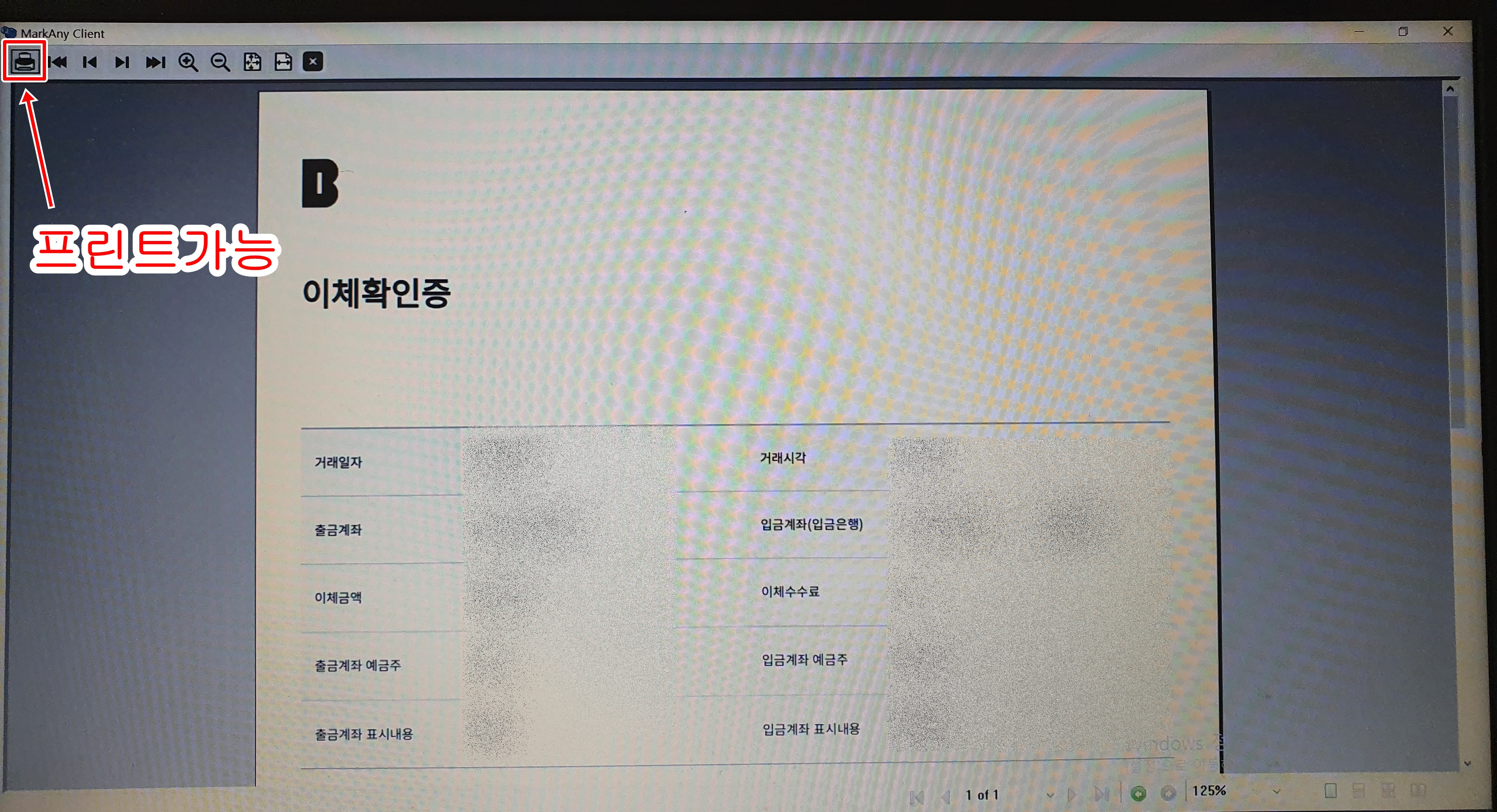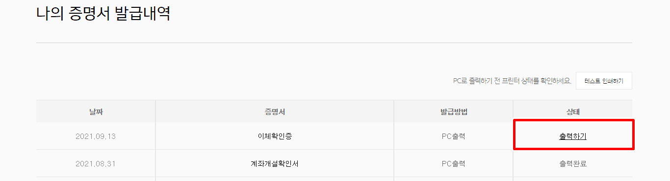 26. 이체확인증 우측의 출력하기를 클릭합니다.