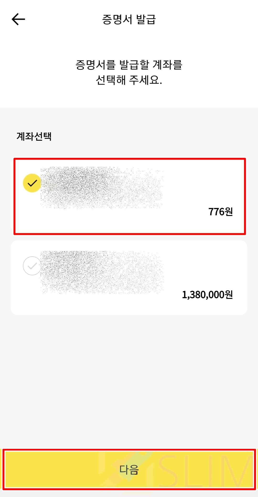 10. 이체확인증으로 내역을 보고 싶은 계좌를 선택한 후 다음을 누릅니다.