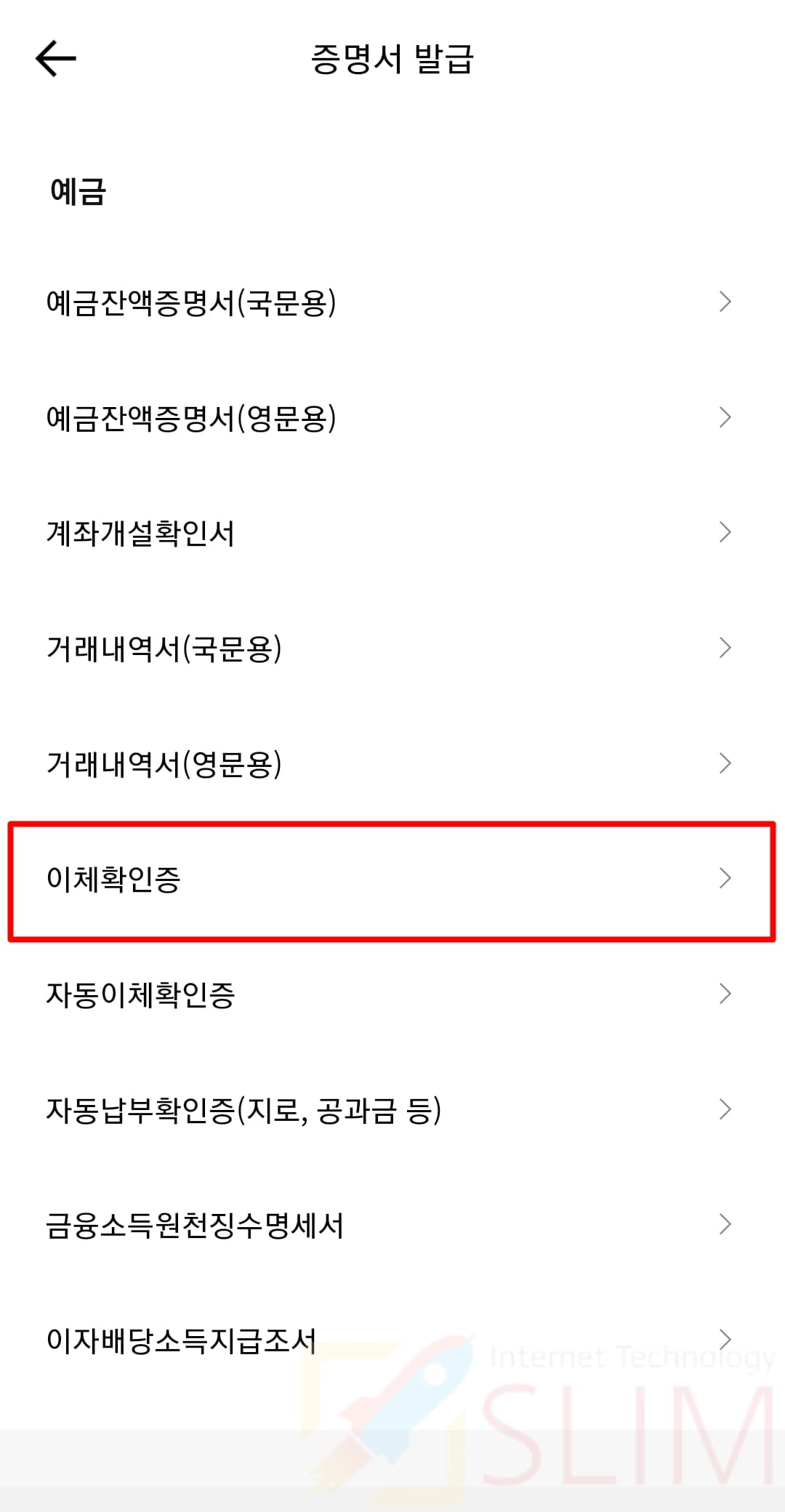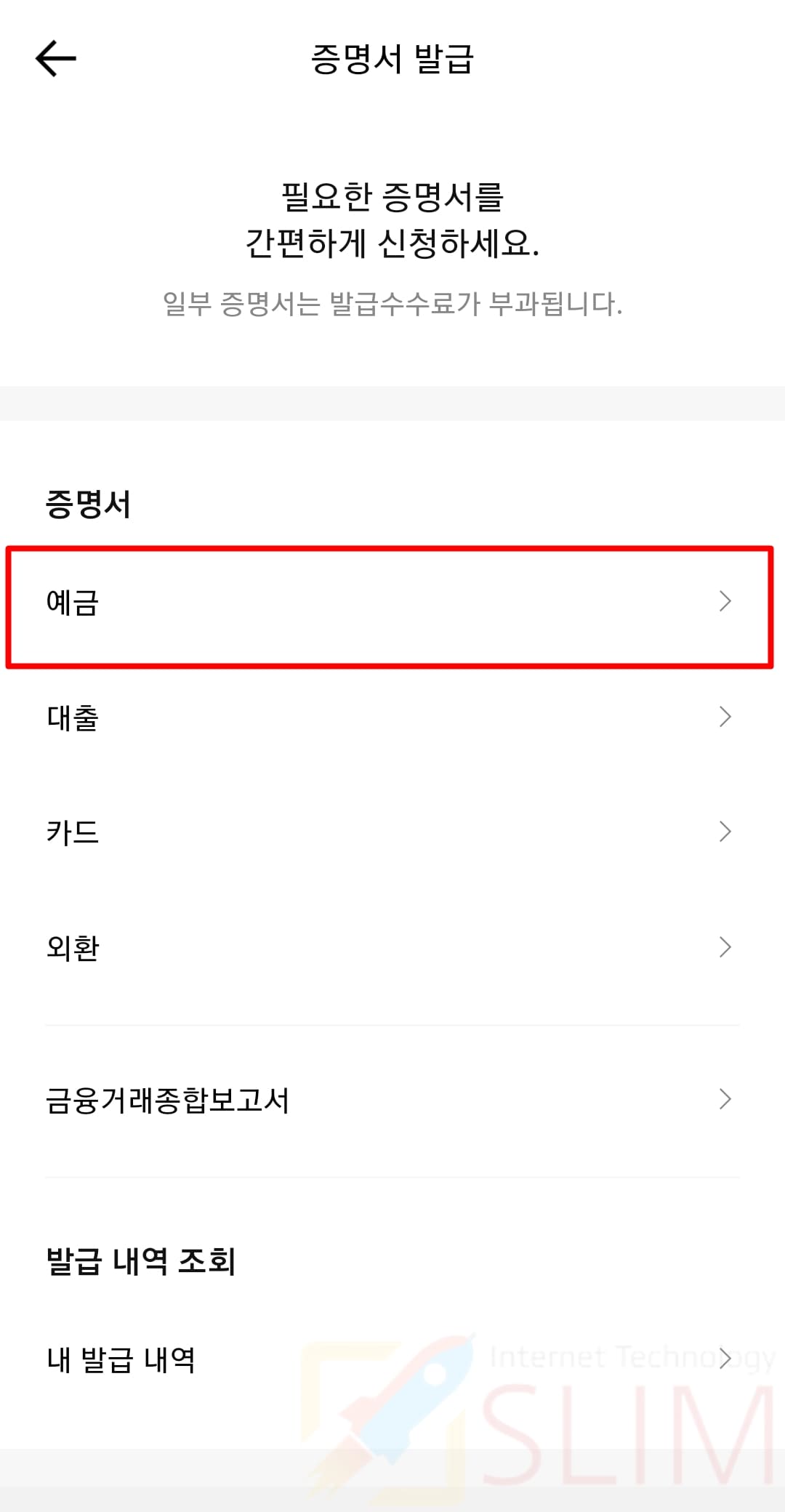 5. 증명서 중 예금 항목을 선택합니다.