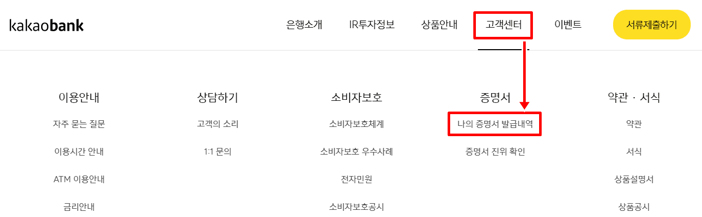 16. 고객센터 > 나의 증명서 발급내역을 클릭합니다.