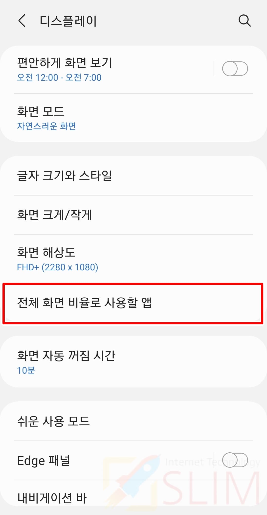 갤럭시 스마트폰을 사용하다보면 특정 앱이나 사이트에서의 화면 비율이 맞지않아서 일부가 잘려서 보이지 않거나 심하게는 이용이 불가능할 때가 있습니다. 이 경우에는 갤럭시 화면비율과 해상도를 바꿔주시면 쉽게 해결할 수 있는데요. 저 같은 경우에는 넓은 화면을 보기 위해서 너비를 넓혀서 사용하고 있는데 왠만한 사이트와 앱을 모두 호환시킬 수 있어서 편리하게 사용하고 있습니다. 참고로 갤럭시에서는 전체비율로 사용할 앱을 지정하여 화면비율이 맞지 않아 잘려 표시되는 앱을 전체 화면으로 자동 변경하여 사용할 수 있는 기능이 있어서 함께 이용하시는 것을 추천드립니다.