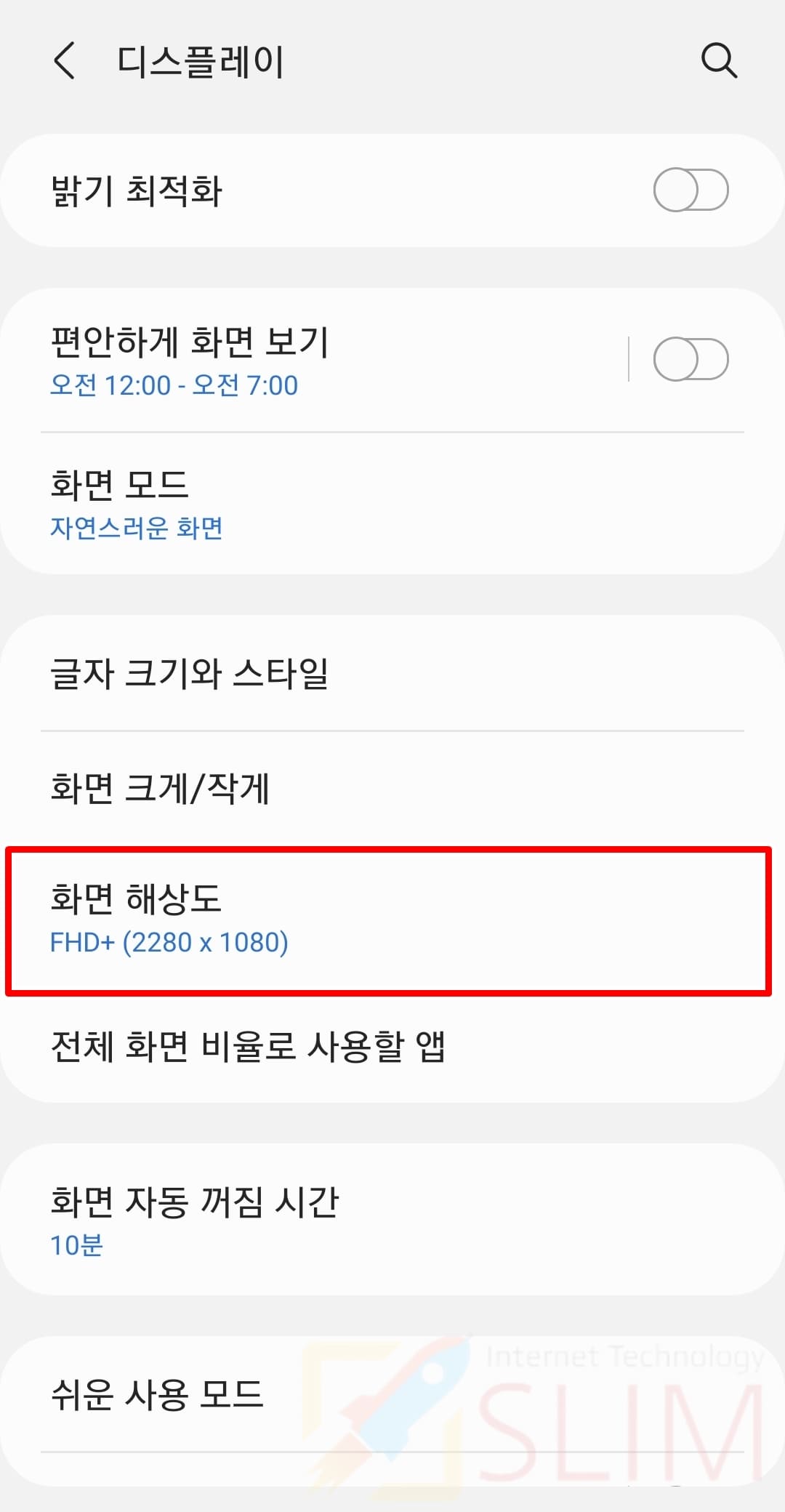 - FHD+는 배터리 소모가 중간 정도이며 어느정도 향상된 화질을 사용할 수 있습니다.
