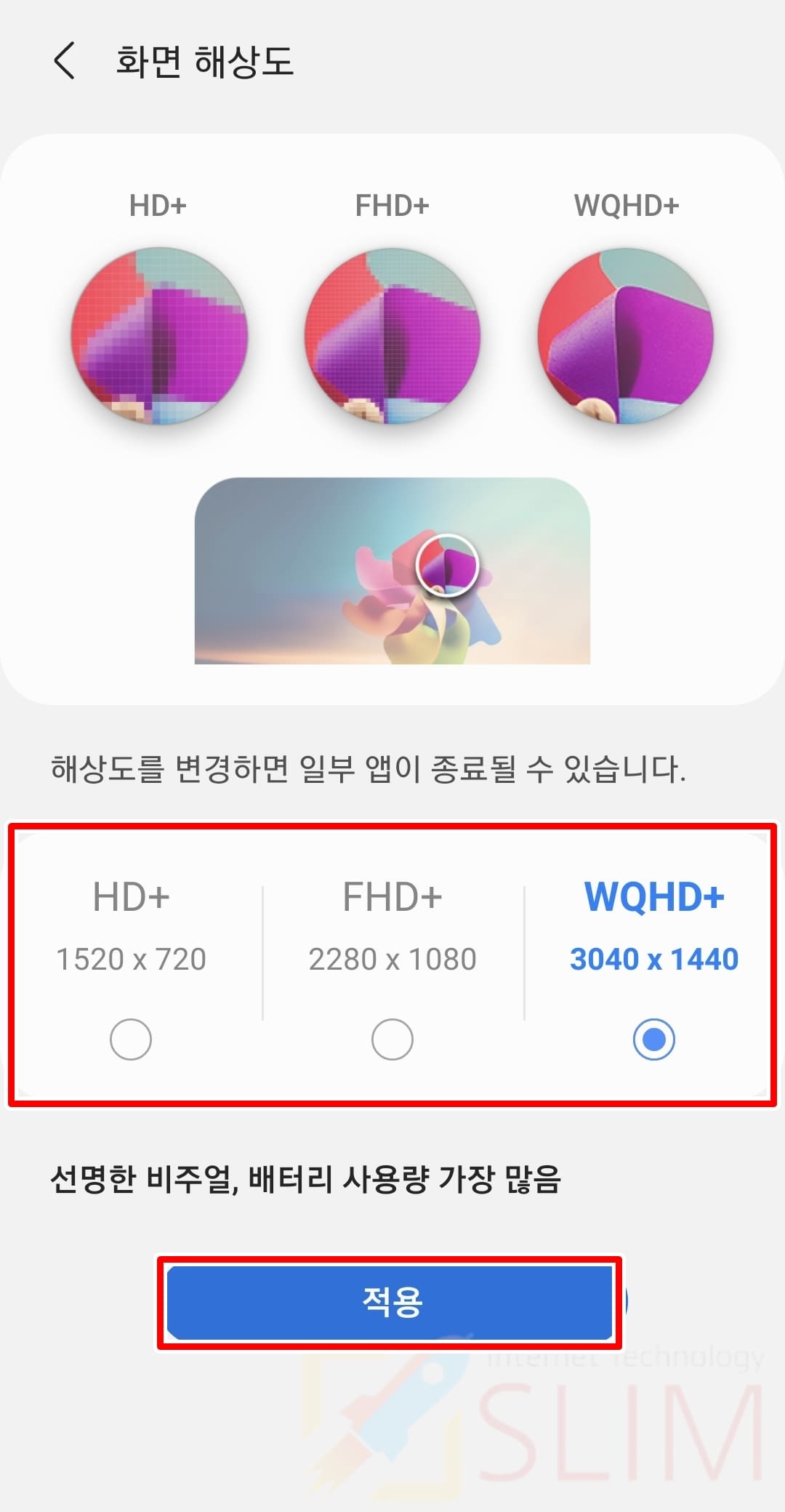또한 갤럭시에서는 해상도를 직접 변경도 시켜줄 수 있는데요. 해상도가 높아지면 사진이나 동영상을 더 선명한 고화질로 볼 수 있고, 확대를 하더라도 픽셀 깨짐 현상이 보이지 않게 됩니다. 갤럭시에서는 WQHD+라는 3040X1440까지 기본 설정에서 적용시킬 수 있는데요. 적용시 높은 고화질로 유튜브같은 앱을 이용하기도 좋고, 사진 편집 앱을 이용할 때도 큰 도움을 받을 수 있습니다. 다만 해상도가 높아지면 배터리 소모가 커짐으로 특정한 순간에만 잠시 설정하여 사용하는 것이 스마트폰을 오래 사용할 수 있으니 참고하시길 바랍니다.