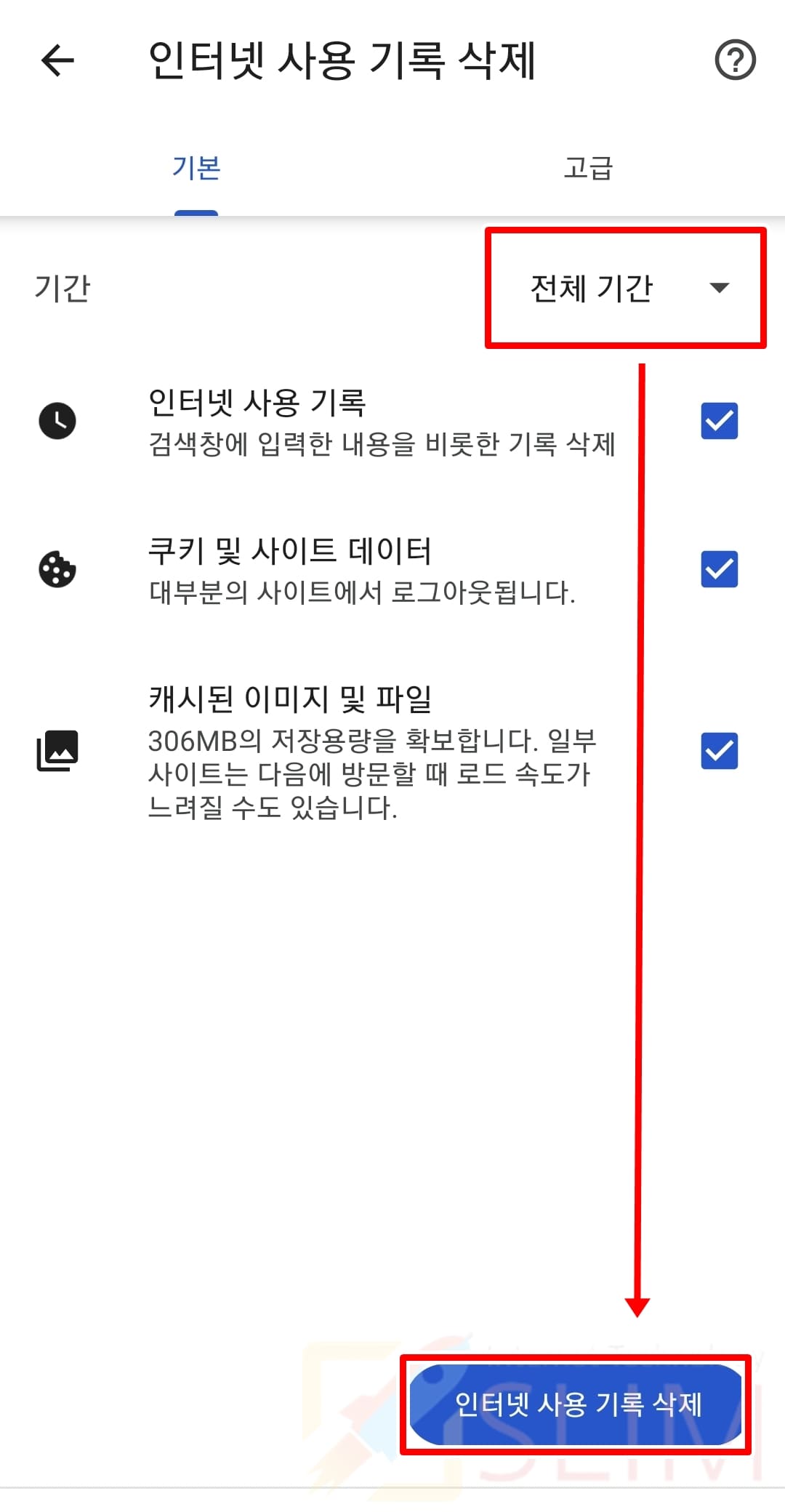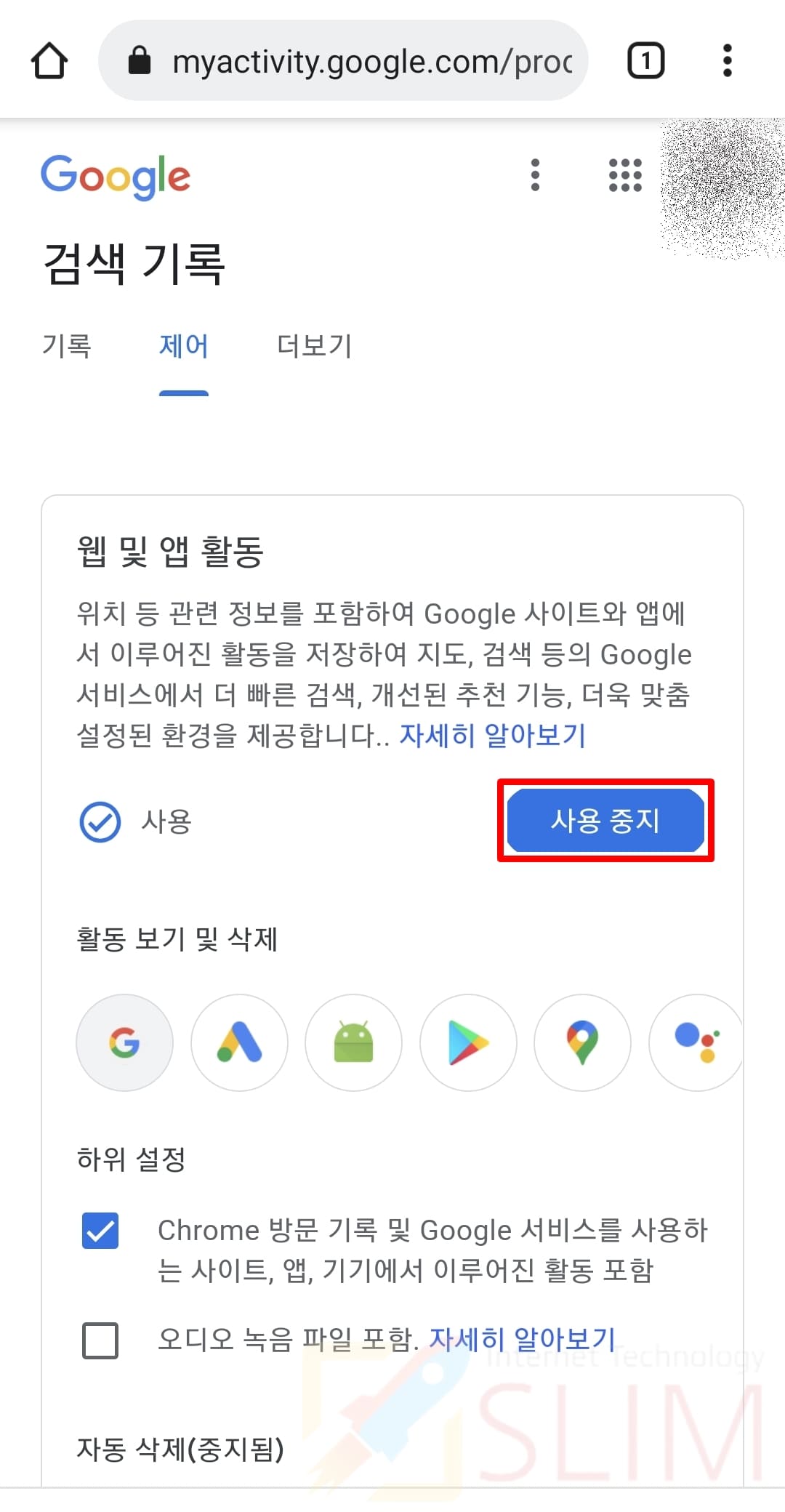 위의 검색기록 서비스를 중지하더라도 이 전에 저장된 데이터는 삭제되지 않기 때문에 현재까지 저장된 모든 검색기록을 지워주기 위해서는 아래 방법을 적용하셔야 합니다.