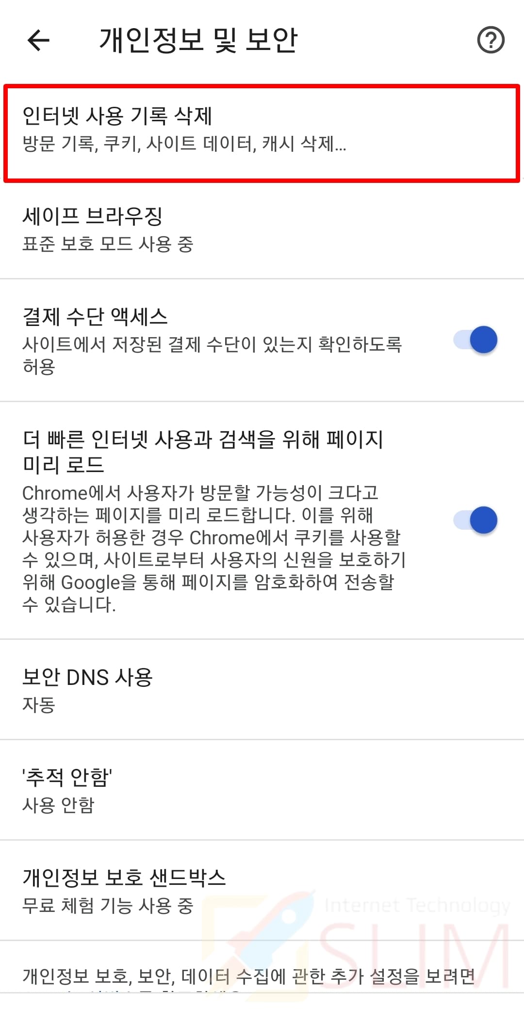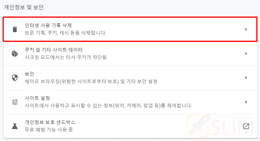 3. 개인정보 및 보안 아래의 인터넷 사용 기록 삭제를 누릅니다.