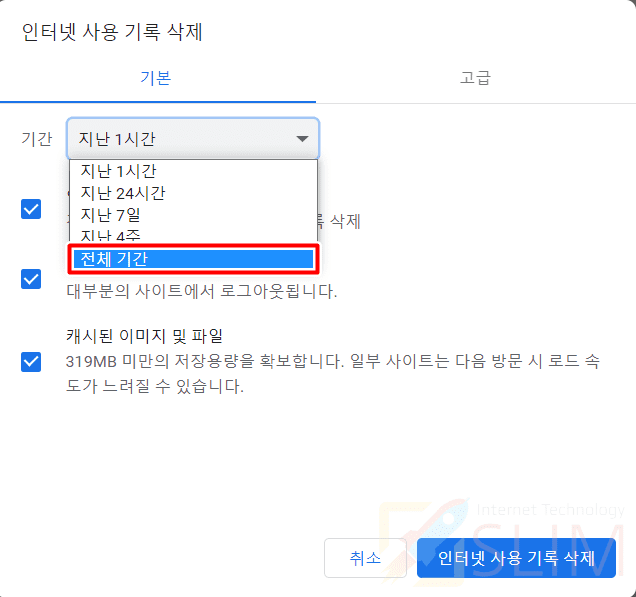 4. 인터넷 사용 기록 삭제를 클릭합니다.