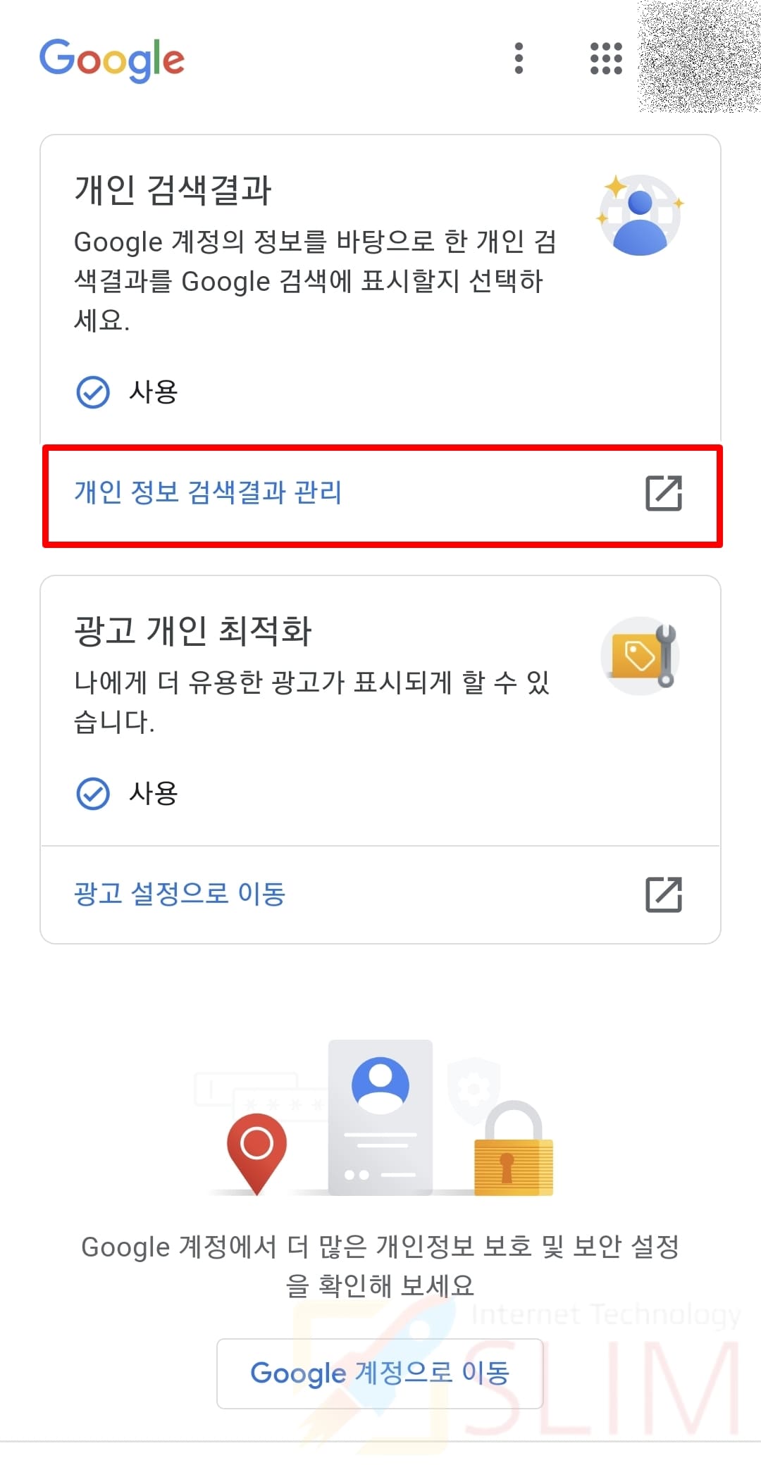 10. 개인 정보 검색결과 관리를 클릭합니다.
