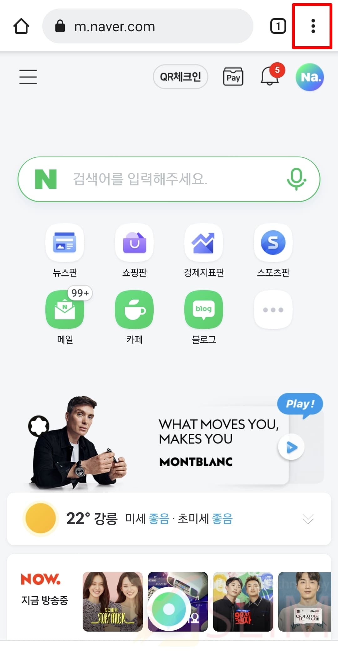 1. 크롬 앱의 우측 상단 더보기 버튼을 누릅니다.