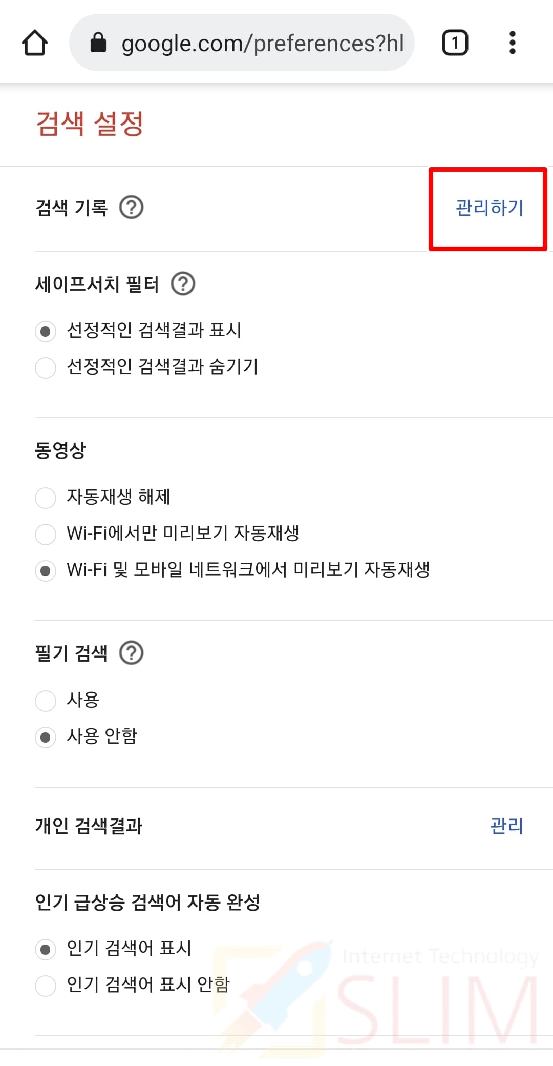 4. 검색 기록 우측의 관리하기를 누릅니다.