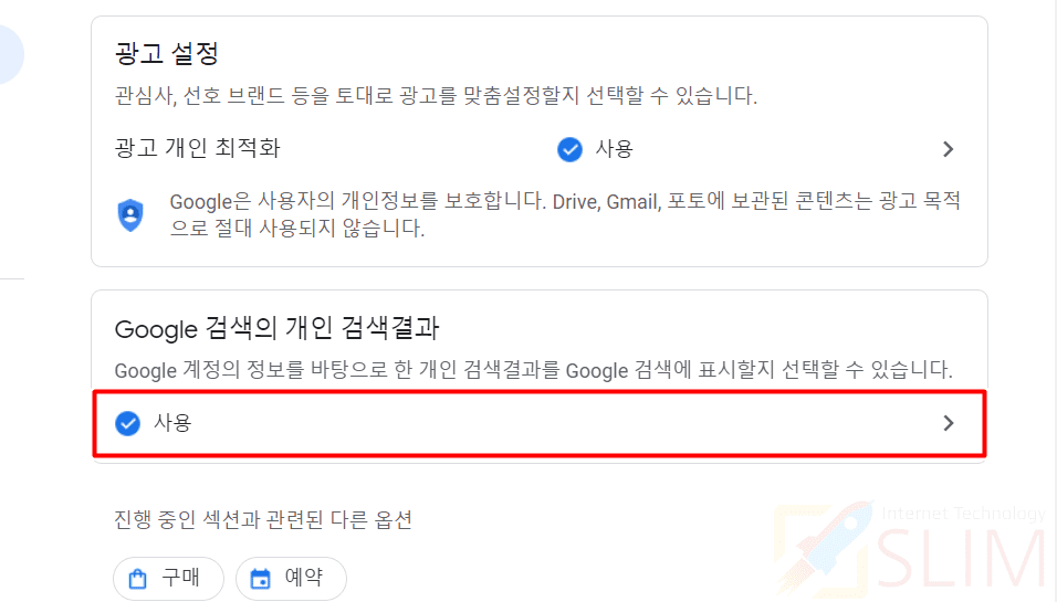 8. 데이터 및 개인 정보 보호 항목에 있는 Google 검색의 개인 검색결과를 누릅니다.