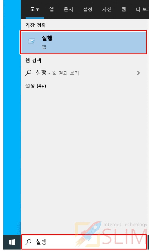 1. 작업표시줄 검색창에서 실행을 입력한 후 앱을 클릭합니다.