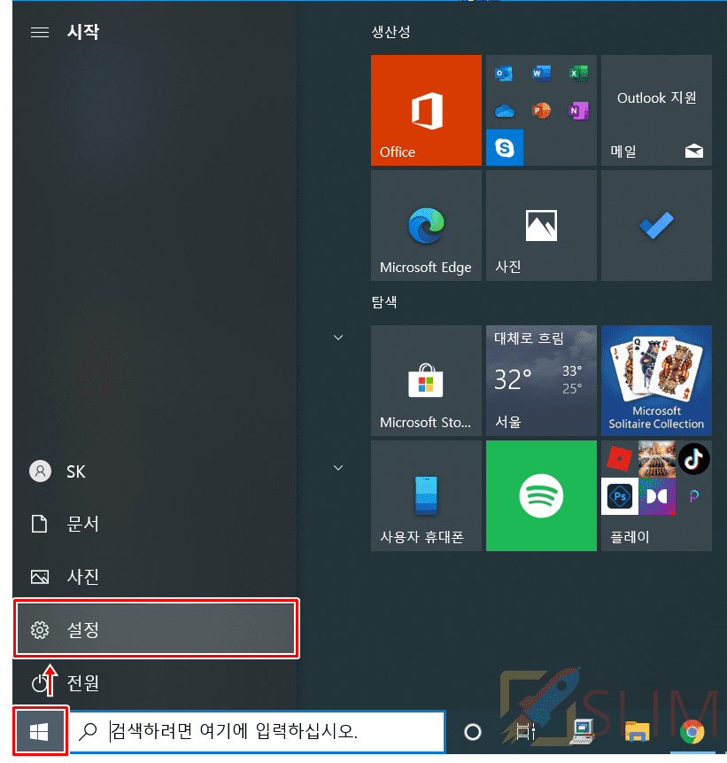 1. 컴퓨터에서 윈도우 버튼을 누르고 설정을 클릭합니다.