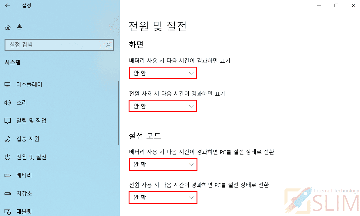 4. 화면 및 절전 모드의 모든 설정을 안 함으로 변경합니다.