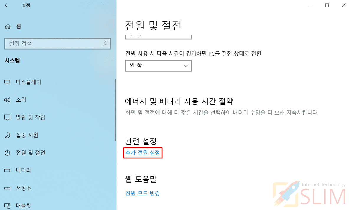 6. 윈도우 설정 > 시스템 > 전원 및 절전에서 추가 전원 설정을 클릭합니다.