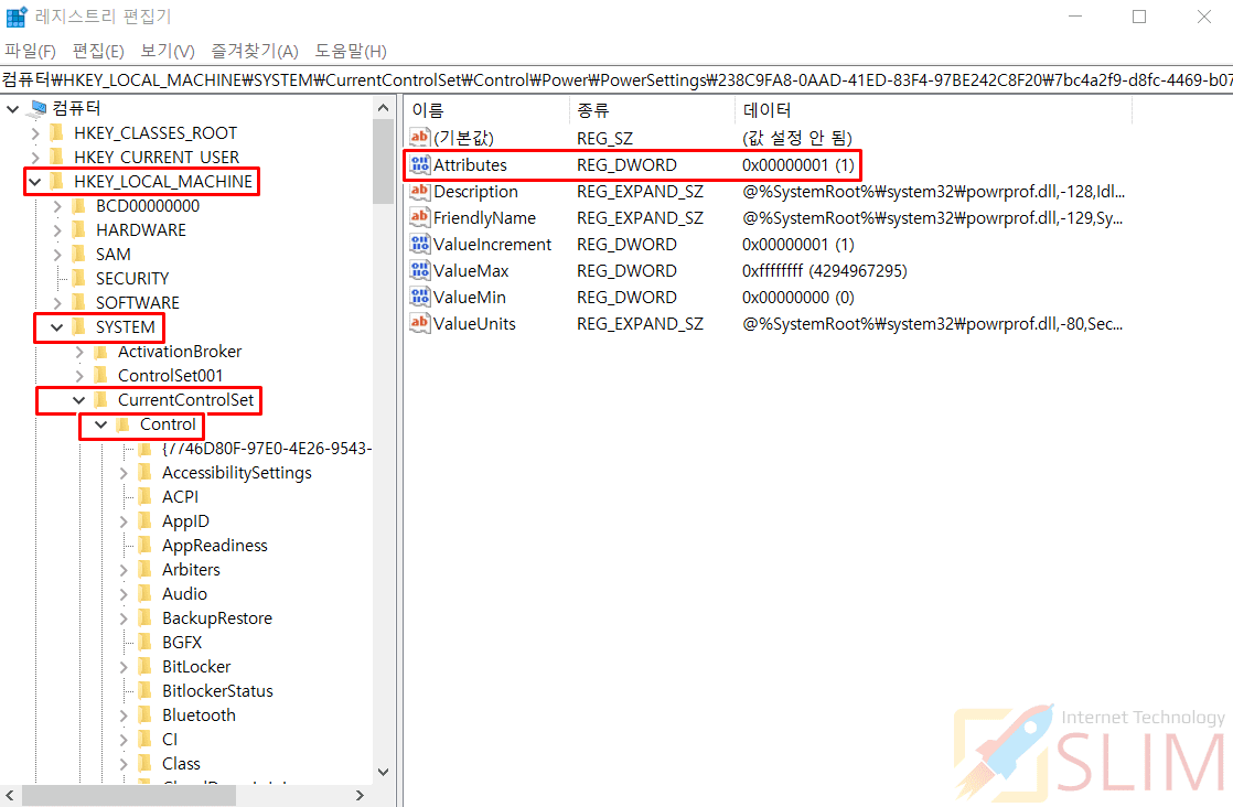 3. HKEY_LOCAL_MACHINE > SYSTEM > CurrentControlSet > Control\Power > PowerSettings > 238C9FA8-0AAD-41ED-83F4-97BE242C8F20 > 7bc4a2f9-d8fc-4469-b07b-33eb785aaca0 경로로 들어갑니다.