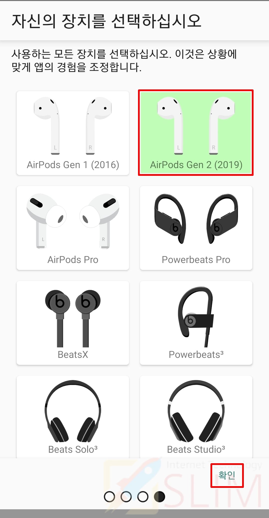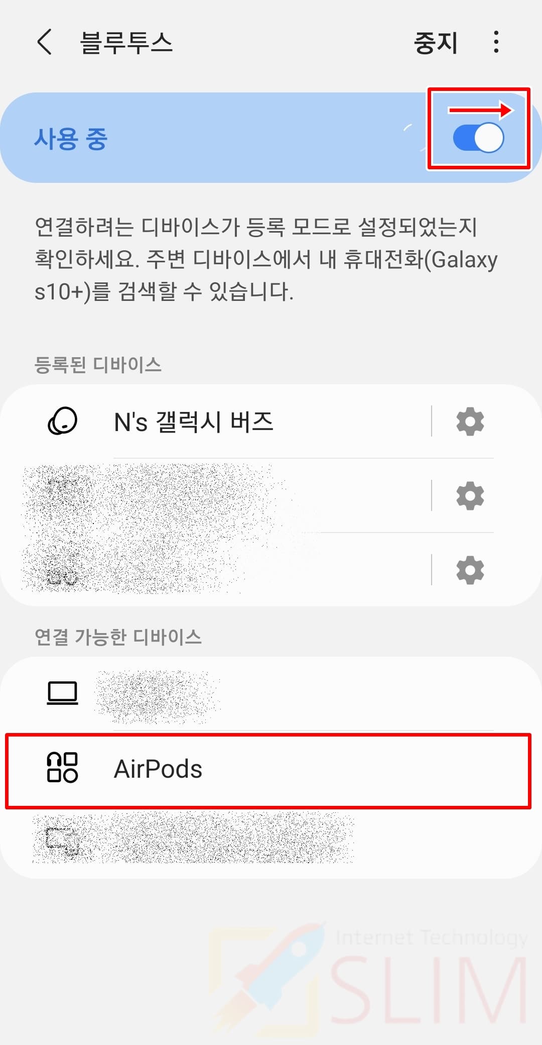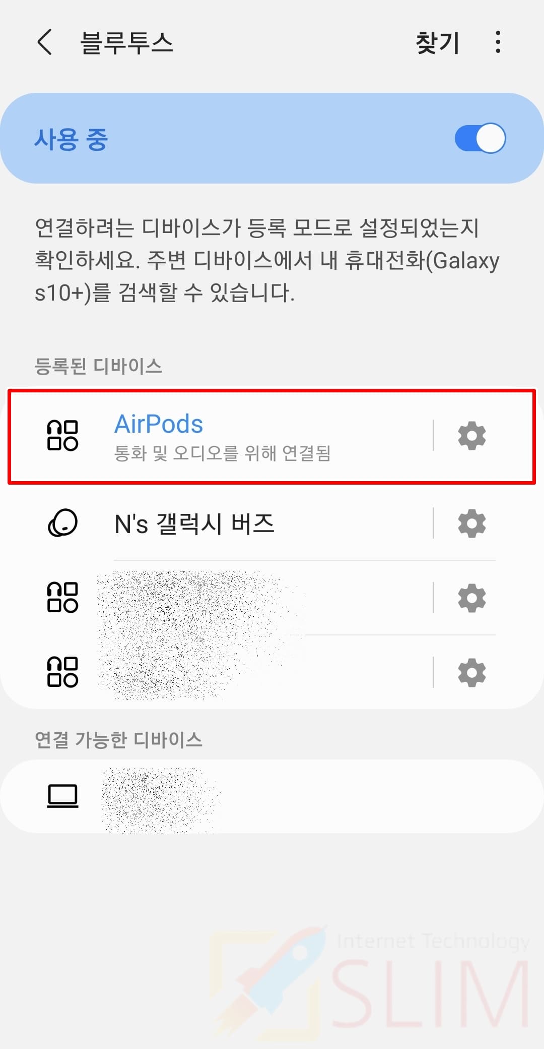 이 화면에서 갤럭시와 에어팟이 연결된 상태라면 자동으로 초록색으로 현재 기기가 표시됩니다. 만약 기기가 다르다면 직접 목록에서 찾아서 선택해주시면 됩니다.