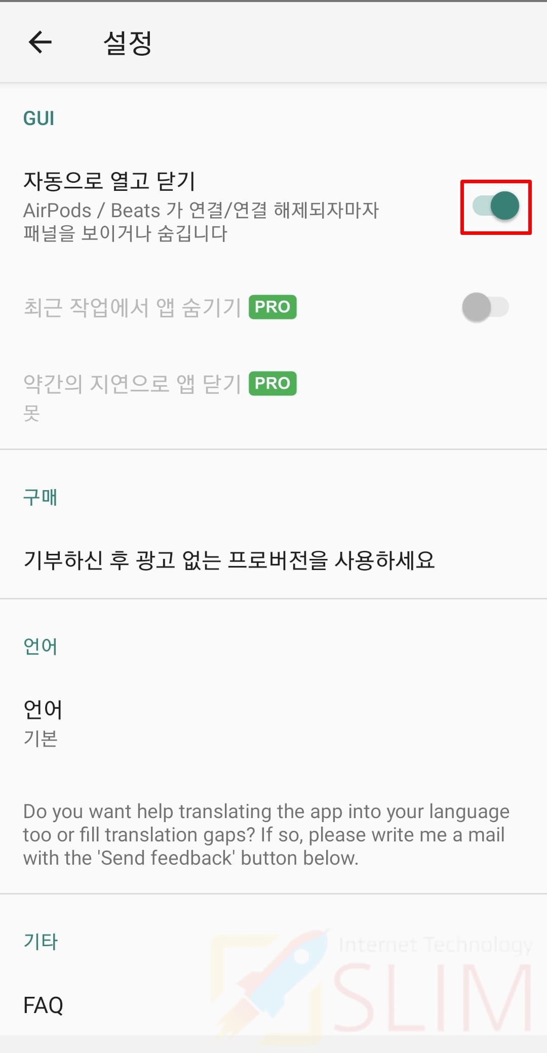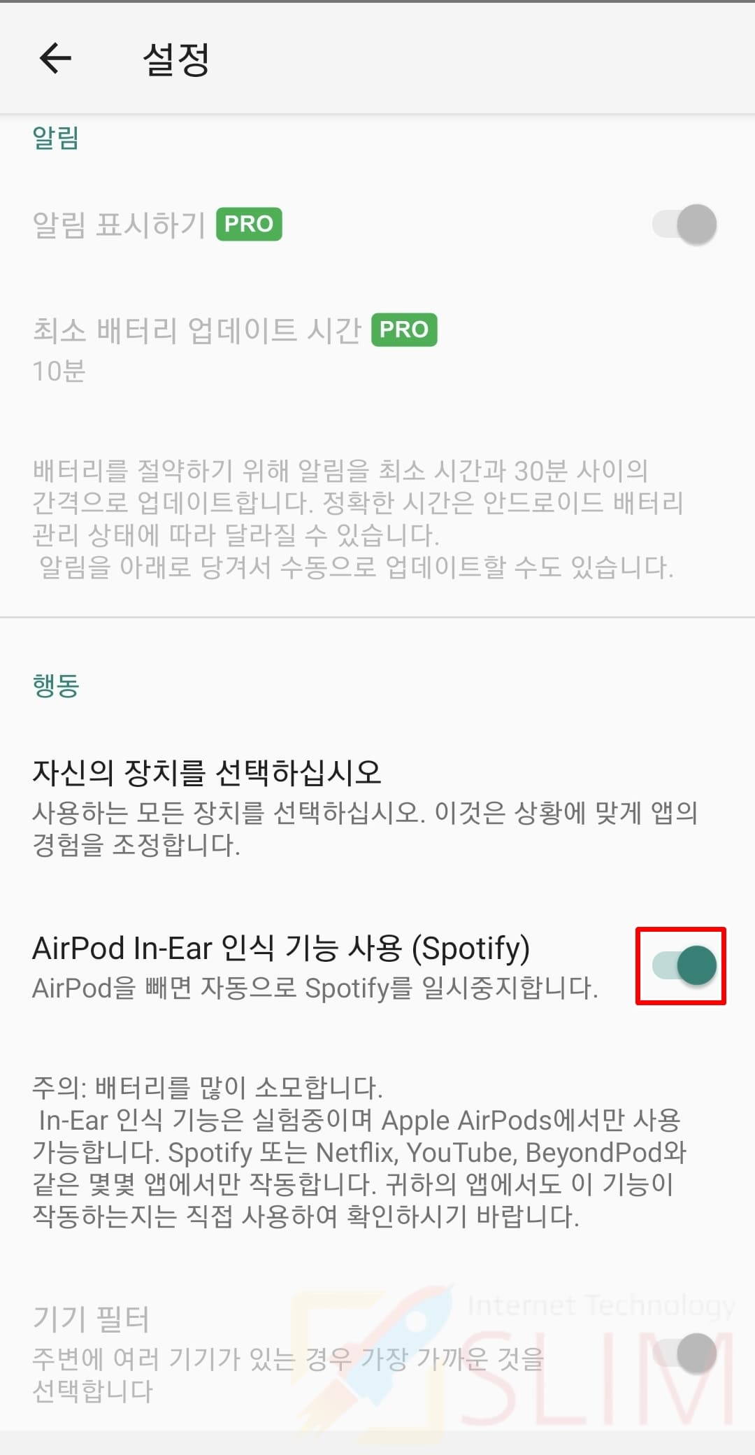 앱을 실행하고 설정을 누르면 위 화면으로 진입할 수 있는데요. 이 앱에서는 IN-Ear 인식 기능을 활성화하여 사용할 수 있습니다. 인이어 기능은 에어팟을 빼면 자동으로 음악 재생을 종료하는 것으로 사용중이지 않은 연결된 에어팟의 배터리를 크게 절약할 수 있어서 활성화를 권장드립니다.