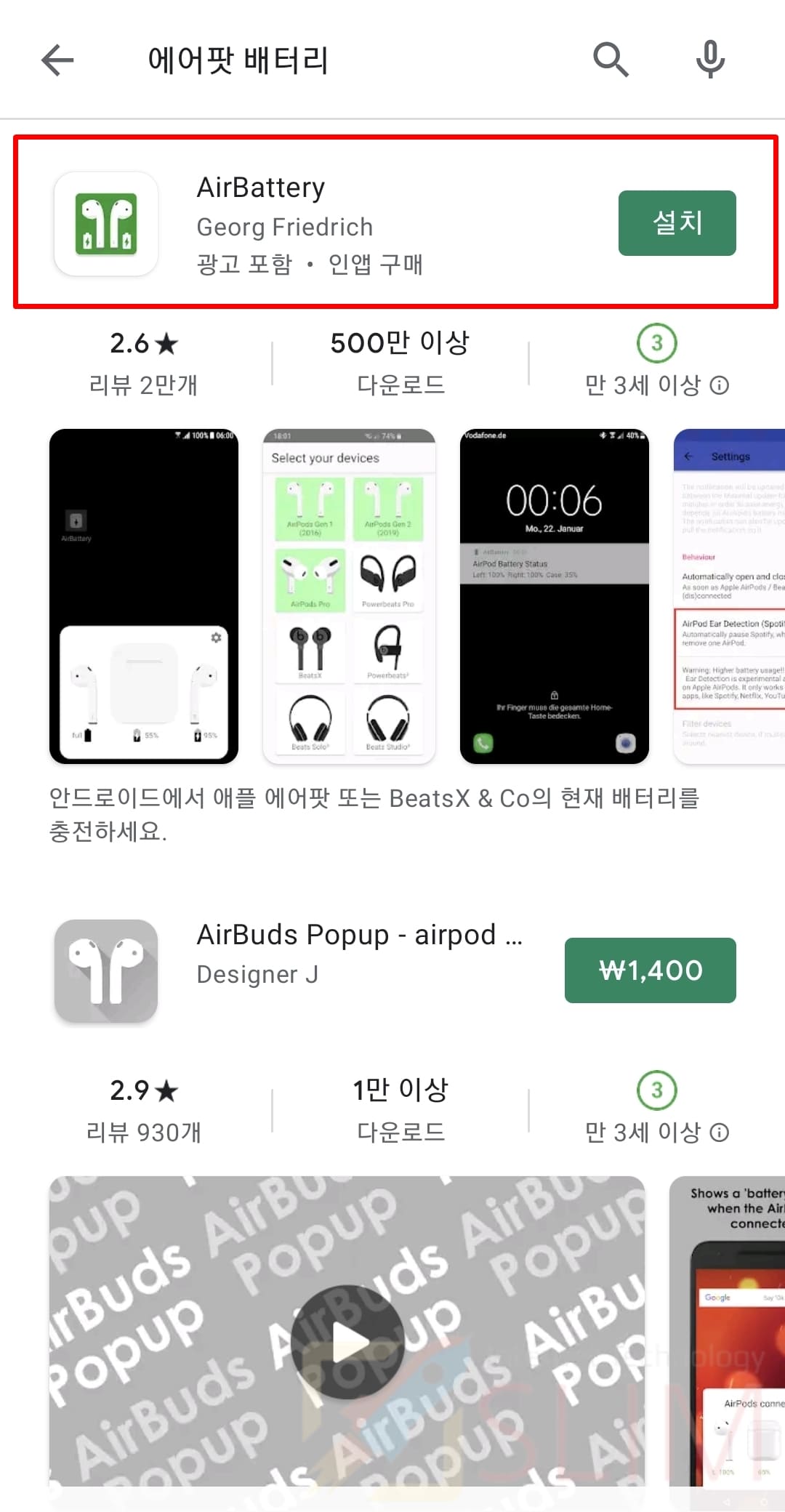 1. 구글 플레이 스토어에서 'AirBattery' 앱을 검색 후 다운로드 받습니다.