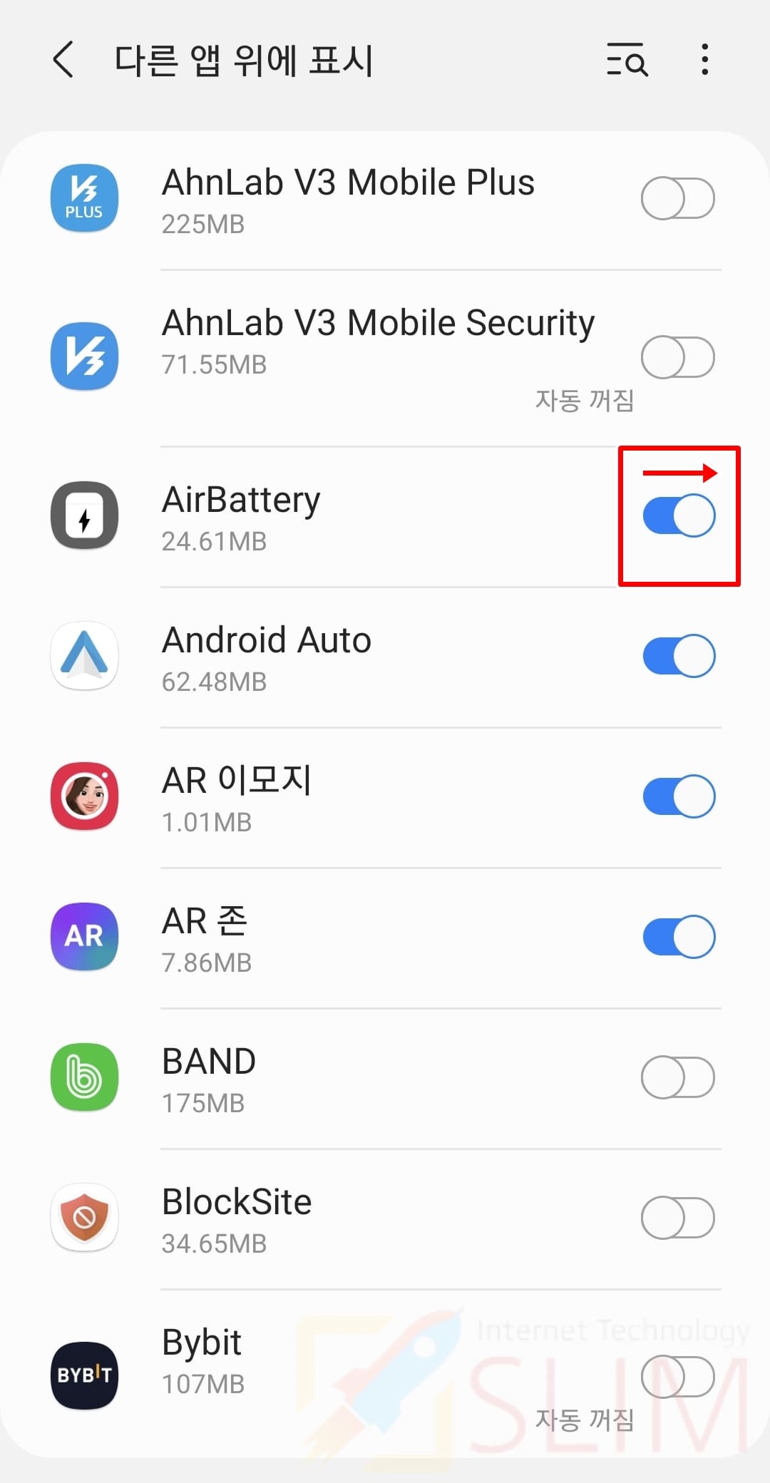 3. 다른 앱 위에 표시 탭에서 AirBattery를 활성화합니다.
