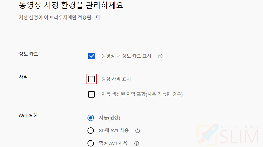 4. 항상 자막 표시의 체크를 눌러 비활성화합니다.
