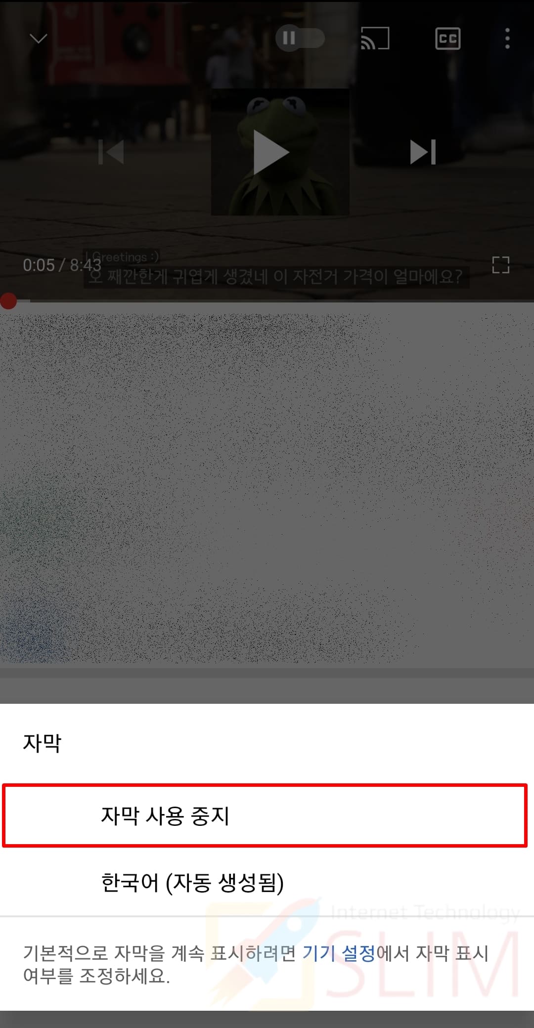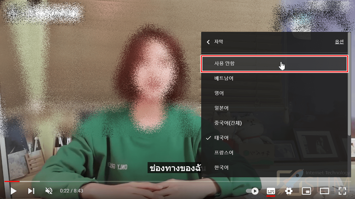 ▲ 위 사진처럼 자막이 생성된 것은 일부 특정한 동영상을 들어갔을 때 유튜버가 한국어 자막을 달아두어서 보여지거나, 외국영상 한정 한국어 자동번역 자막이 달려보일 경우입니다. 불편함이 느껴지신다면 해당 동영상에 설정된 개별 자막기능을 아래 방법으로 꺼주시면 됩니다.