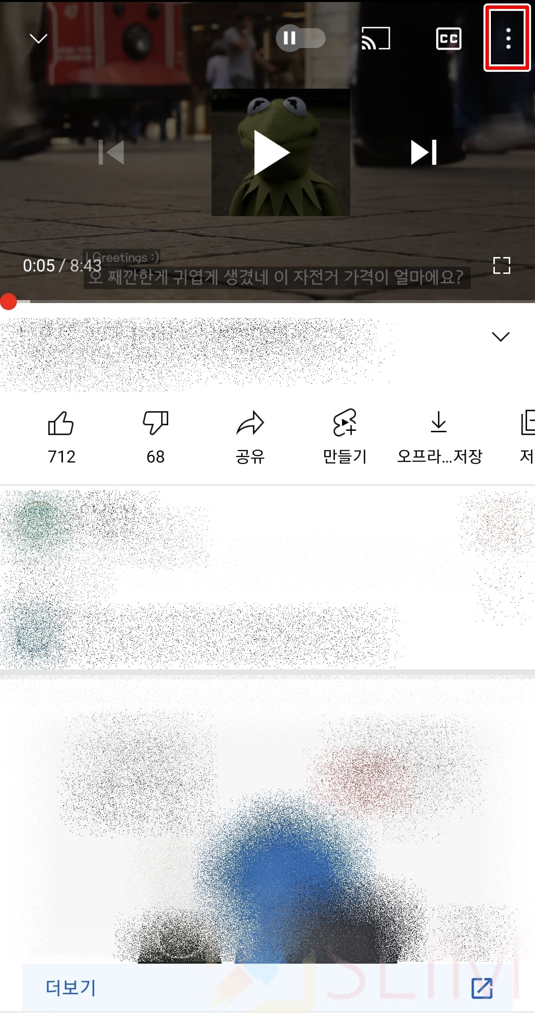 1. 동영상 화면을 한번 클릭하고 우측 상단 더보기버튼(점3개)을 누릅니다.
