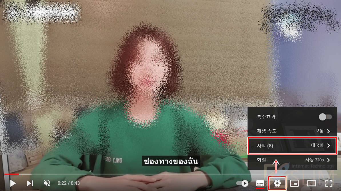 1. 자막이 표시되고 있는 동영상 아래에서 설정버튼(톱니바퀴 모양)을 누릅니다.