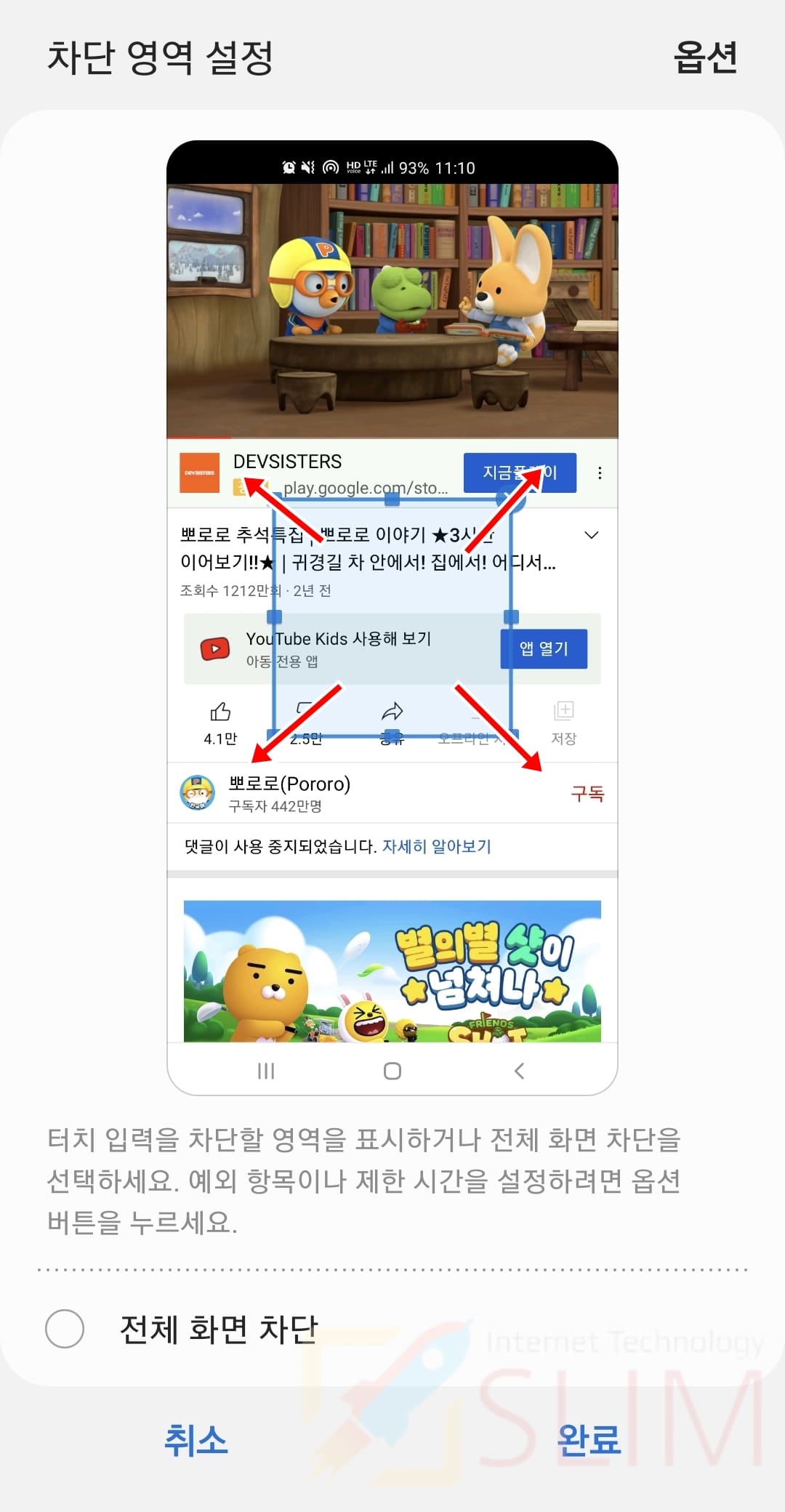 스마트폰에서 동영상을 시청하는 유튜브나 자동으로 게임을 돌리는 게임 앱을 사용할 때 화면의 터치를 잘못 눌러서 앱이 다른 화면으로 바뀌거나 앱이 종료되는 경우가 많습니다. 특히 어린 자녀들에게 유아용 유튜브 동영상을 시청할 때 종종 화면을 건들여서 시청중인 컨텐츠가 중단되거나, 꺼지는 경우가 잦은데요. 이럴 때는 갤럭시 화면터치 잠금을 설정하면 쉽게 해결할 수 있습니다. 화면터치 잠금이란 쉽게 말해 내가 지정한 화면 영역에서는 터치가 동작되어도 인식을 하지 못하게 처리하는 기능인데요. 삼성은 이 기능을 기본 설정으로 제공하고 있어서 모든 사용자는 특정한 앱을 설치하지 않고도 쉽게 사용할 수 있습니다.