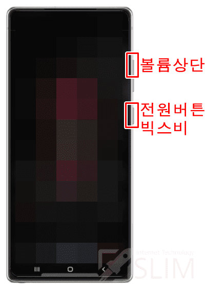 두개의 버튼을 동시에 눌러야 하는데 갤럭시 상위 시리즈의 경우 전원버튼과 빅스비버튼을 동시에 사용함으로 위 이미지와 동일한 두 버튼을 눌러주시면 됩니다. 만약 이전 갤럭시 모델의 경우 전원버튼과 빅스비버튼이 불리되어 있으니 구분하셔서 눌러주시면 됩니다. 이 때 길게 눌러주실 필요없이 동시에 한번만 눌러주세요.