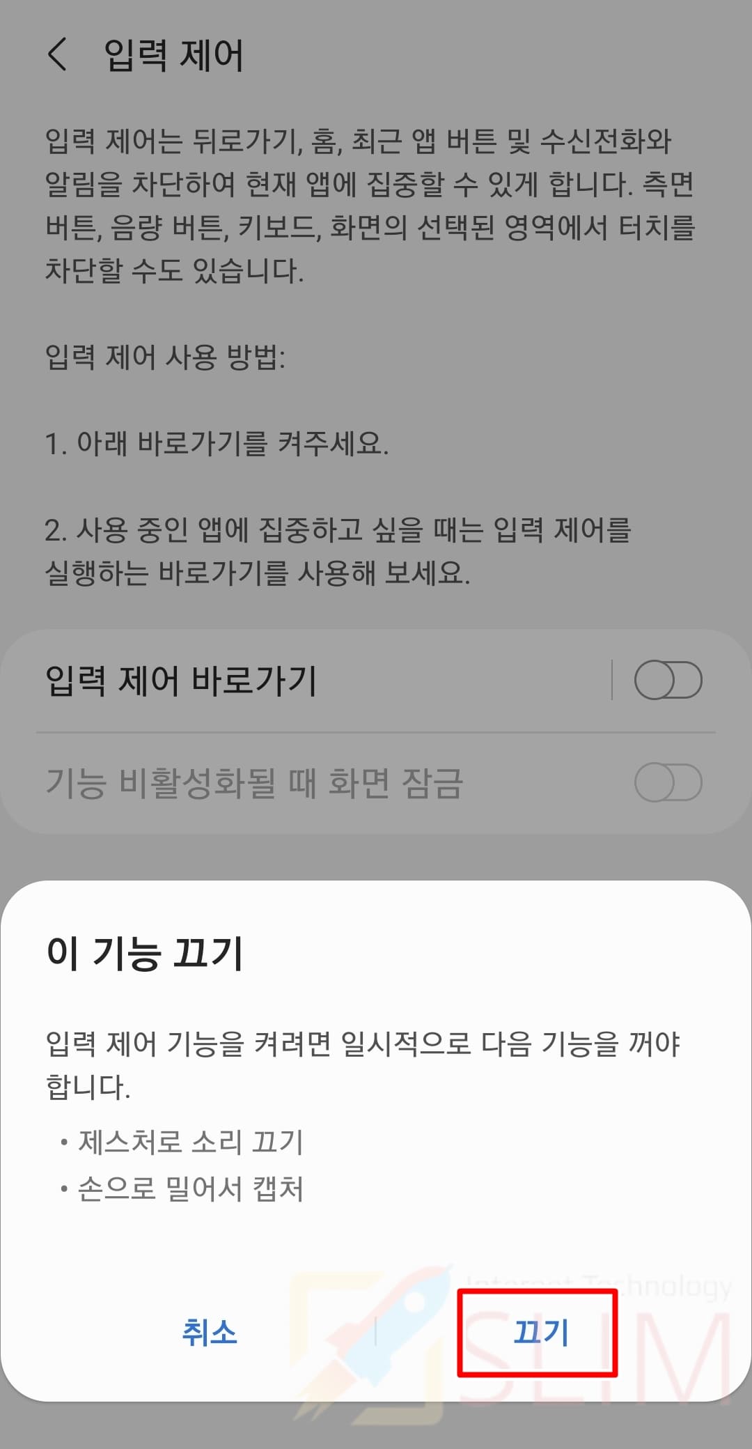 "이제부터 입력 제어를 사용할 수 있어요." 알림 메시지가 보이면 터치 잠금이 시작된 것입니다. 그래서 영역으로 지정했던 부분을 클릭하더라도 스마트폰에서는 어떠한 동작도 작동하지 않습니다.