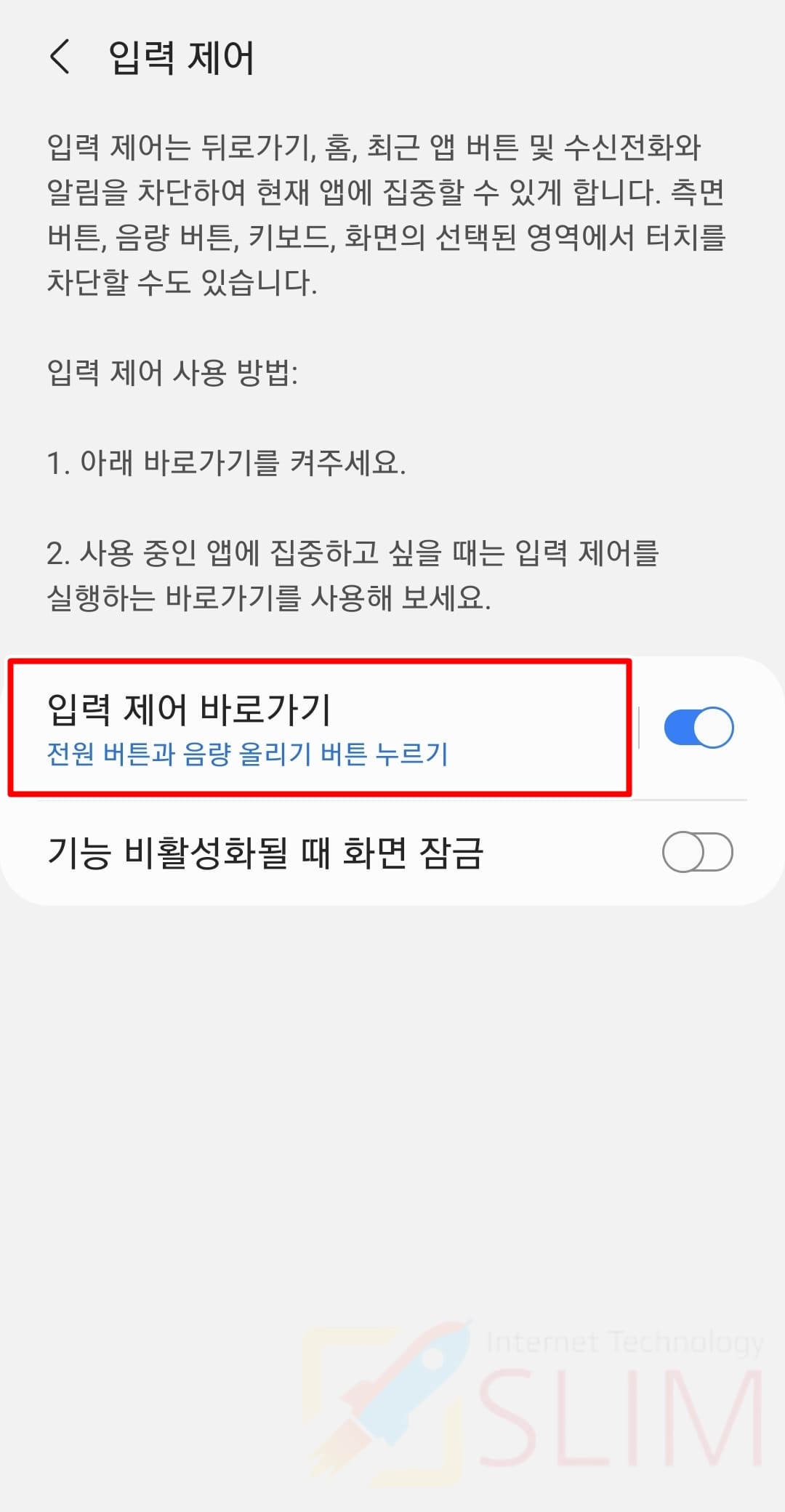 아래를 보시면 기능 비활성화될 때 화면 잠금이 있는데 이 기능은 비활성화로 이용하는 것이 편리하더군요. 그래서 위 화면처럼 입력 제어만 활성화된 것을 확인한 후 넘어가주시면 되겠습니다.