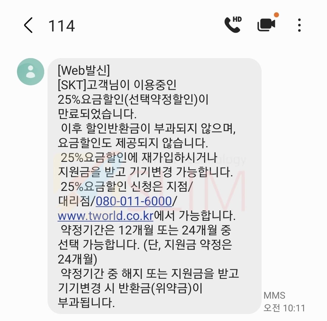 "[SKT]고객님이 이용중인 25%요금할인(선택약정할인)이 만료되었습니다. 이 후 할인반환금이 부과되지 않으며, 요금할인도 제공되지 않습니다. 25%요금할인에 재가입하시거나 지원금을 받고 기기변경 가능합니다. 재가입시 약정기간은 12개월 또는 24개월 중 선택 가능합니다."