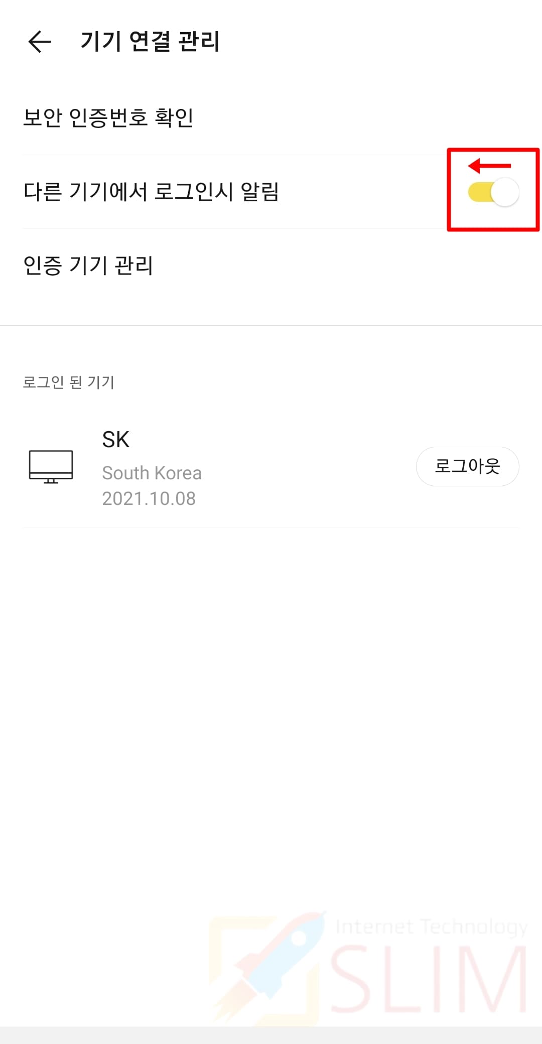 4. 다른 기기에서 로그인시 알림 우측 바를 눌러 왼쪽으로 비활성화합니다.