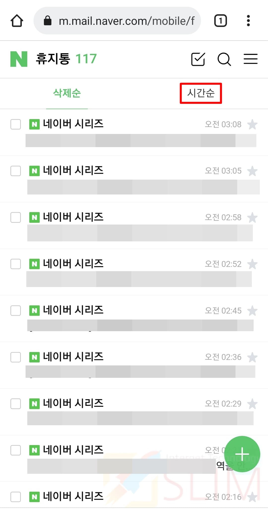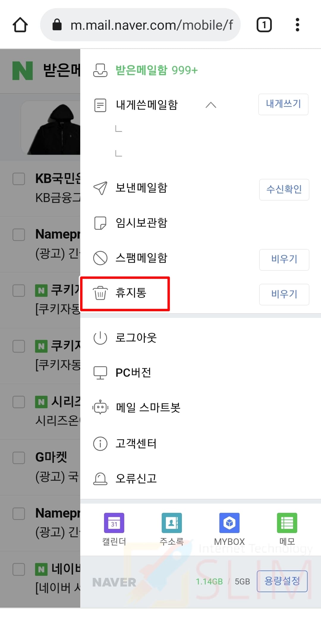 1. 이메일 메뉴에서 휴지통을 누릅니다.