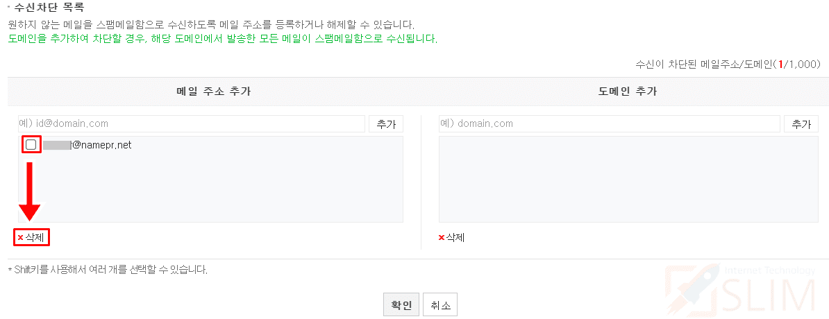 2. 차단 목록에서 인증메일 주소를 선택하여 해제합니다.