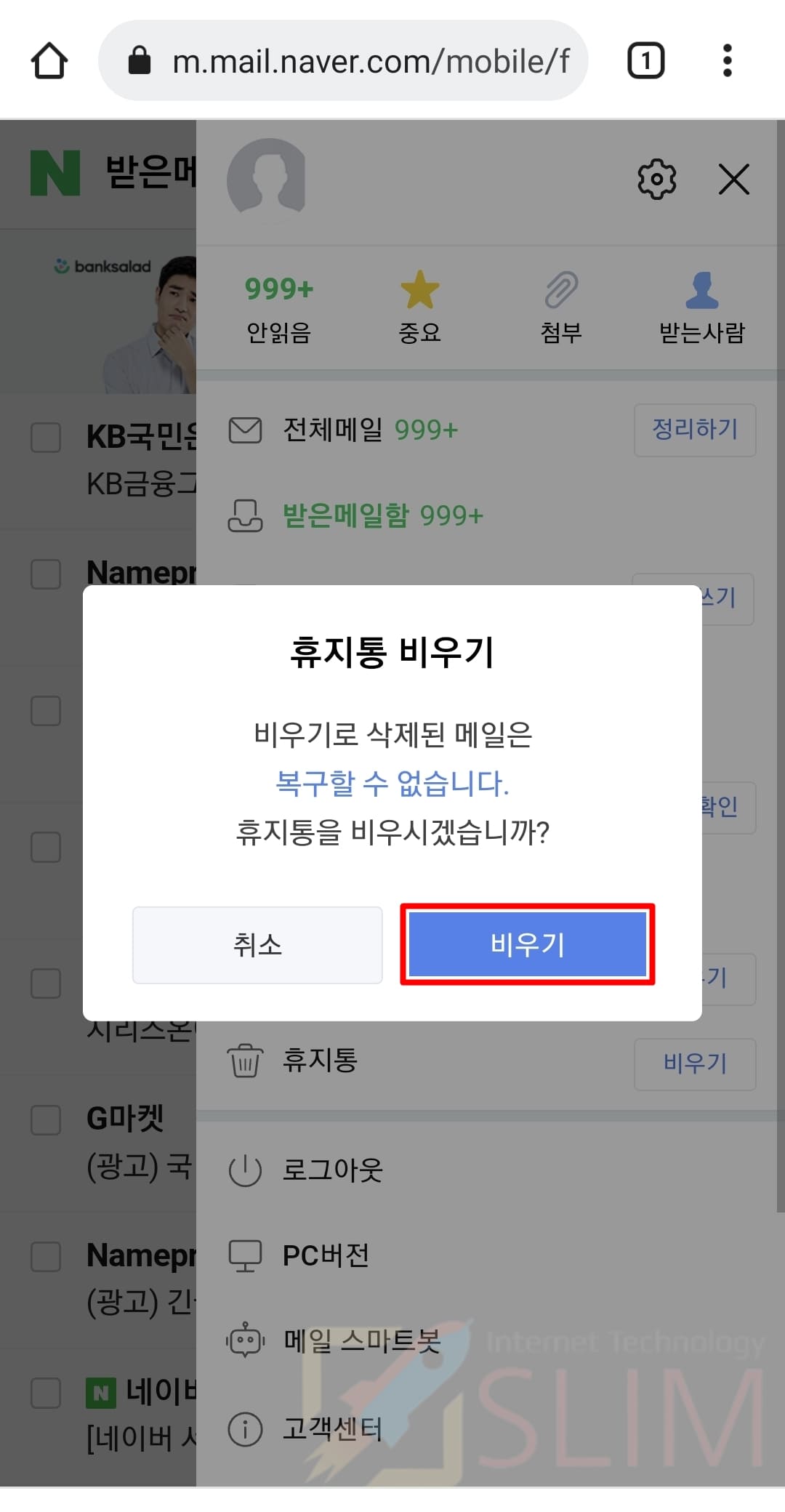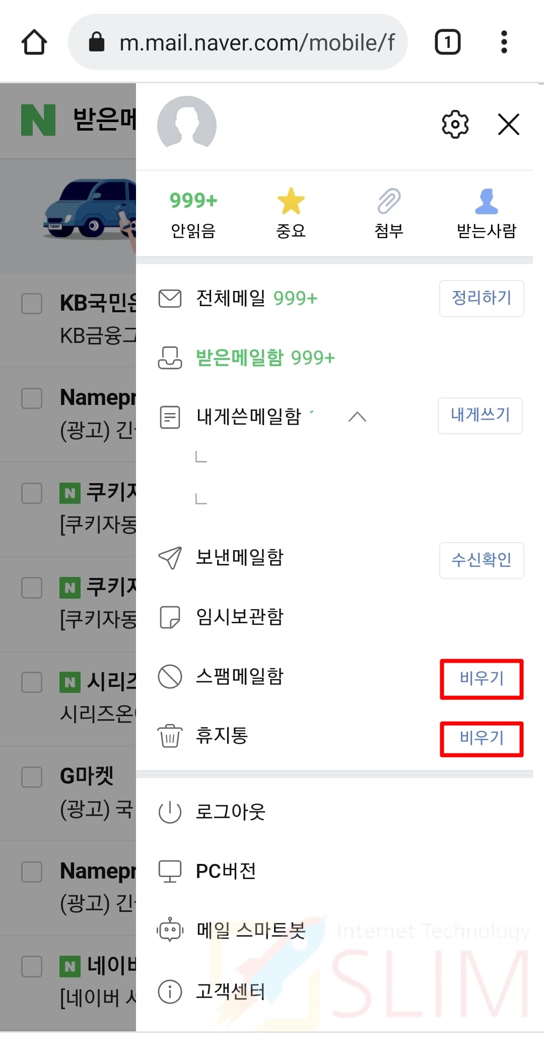 1. 스팸메일함과 휴지통의 비우기 버튼을 누릅니다.