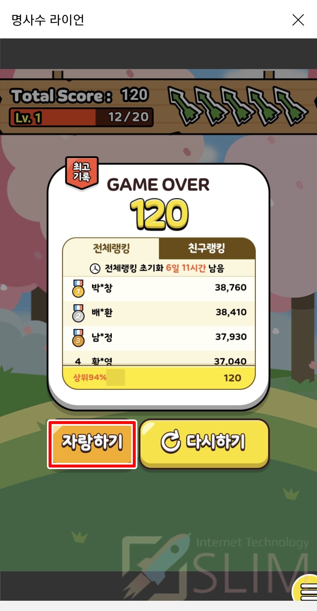 1. 게임이 끝나면 자랑하기 버튼을 누릅니다.