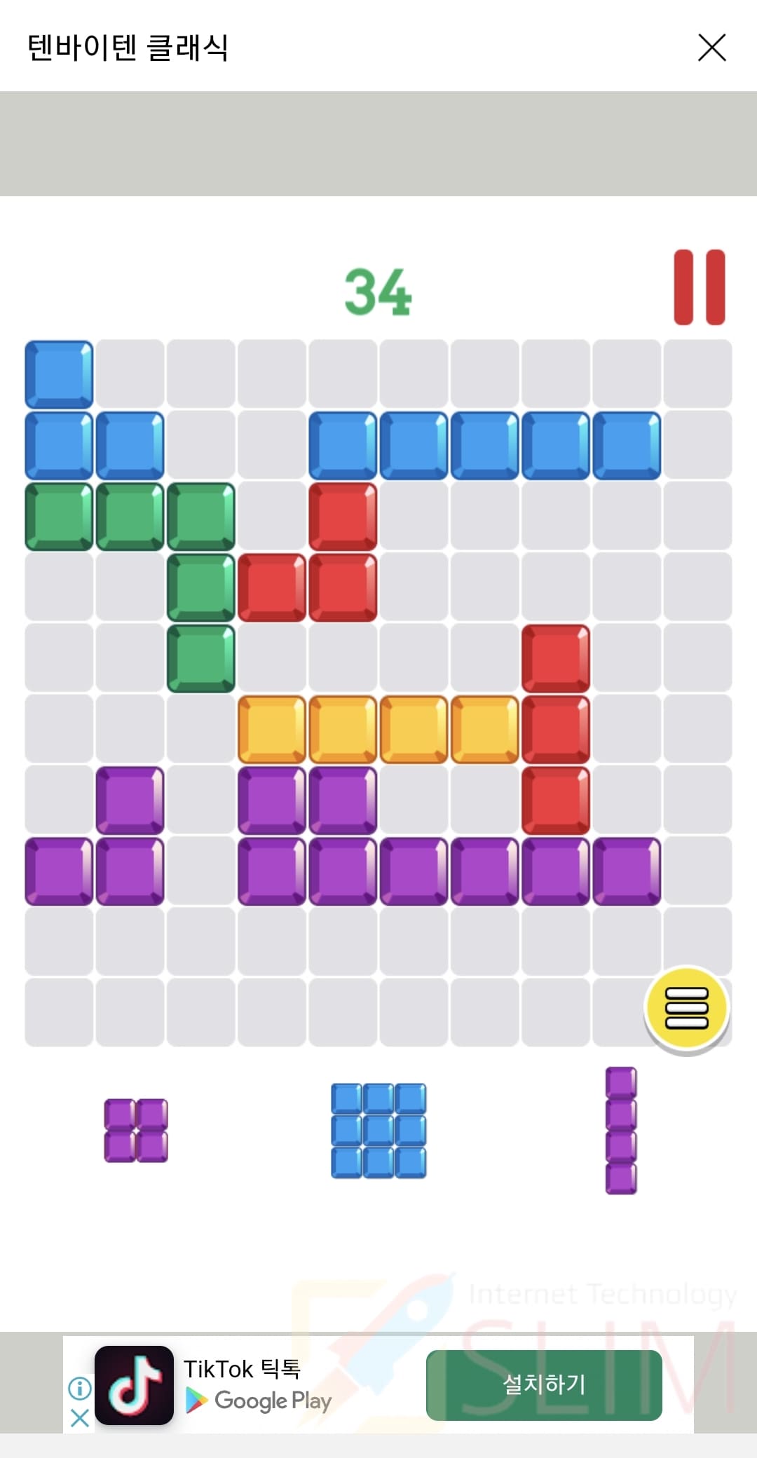 여기서 제가 추천드리고 싶은 게임은 텐바이텐 클래식이 있는데요. 퍼즐 불러쌓기와 같은 플레이 방식으로 가로와 세로가 모두 채워지면 사라지게 되며, 퍼즐을 더이상 넣을 곳이 없어질 때까지 차곡차곡 정리해가는 게임입니다. 퍼즐의 모양과 현재 화면에 채워진 퍼즐들을 보고 가장 최적의 위치로 정리를 해나가야지만 고득점이 가능하기 때문에 순발력과 뛰어난 정리능력이 필요합니다.