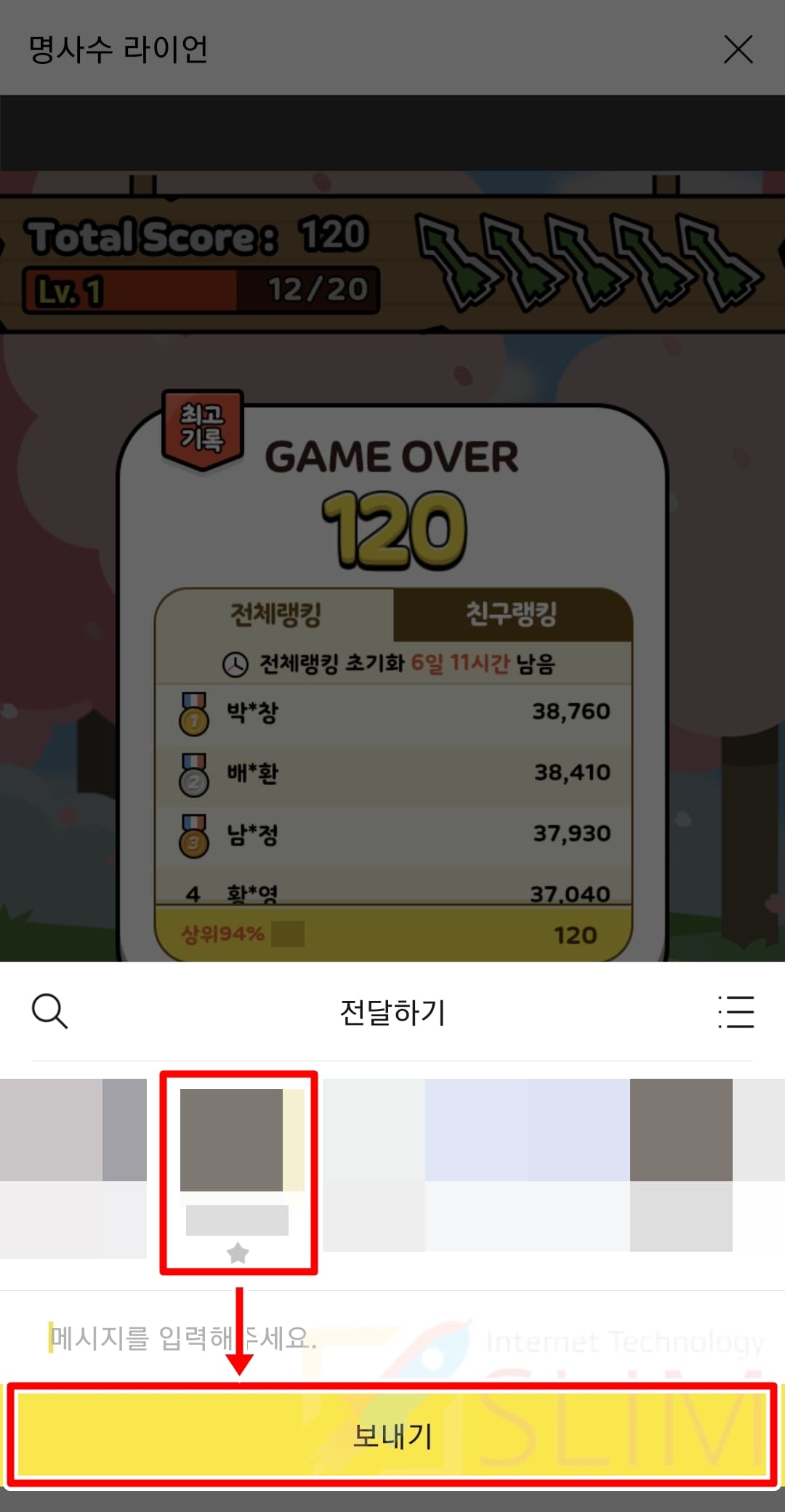 친구는 받은 메시지에 있는 '게임 바로가기'를 누르면 해당 게임을 바로 플레이할 수 있게 됩니다. 서로간 친구랭킹으로 점수를 내기할 수도 있기 때문에 재밌게 경쟁하며 즐겨보시길 바랍니다.