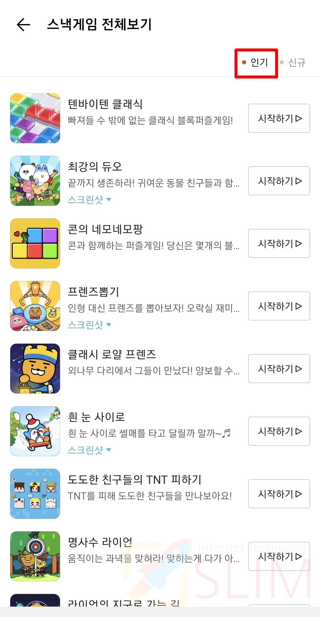목록 우측 상단에서는 인기/신규 버튼이 있는데요. 인기는 카카오톡에서 가장 많이 플레이되고 있는 스낵게임을 순위별로 확인할 수 있고, 신규에서는 새롭게 출시된 스낵게임을 확인할 수 있습니다.