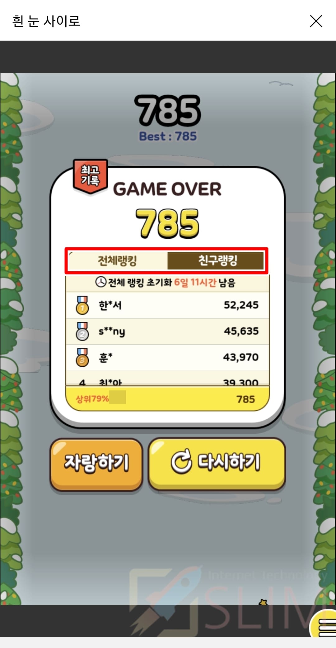 7. 스낵게임의 전체랭킹과 친구랭킹을 확인할 수 있습니다.