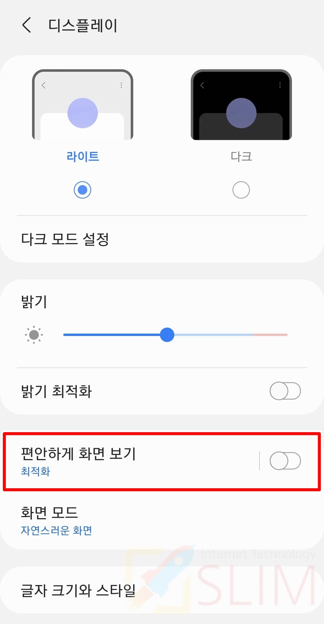 오늘은 여기까지 갤럭시 화면모드 색감 바꾸는 2가지 방법을 소개드렸는데요. 이렇게 디스플레이 항목에서 모두 변경이 가능한데 어두운 화면을 좋아하신다면 '다크모드'를 함께 사용해보시거나, 밝기를 조절해서 이용하시는 것을 추천드립니다.