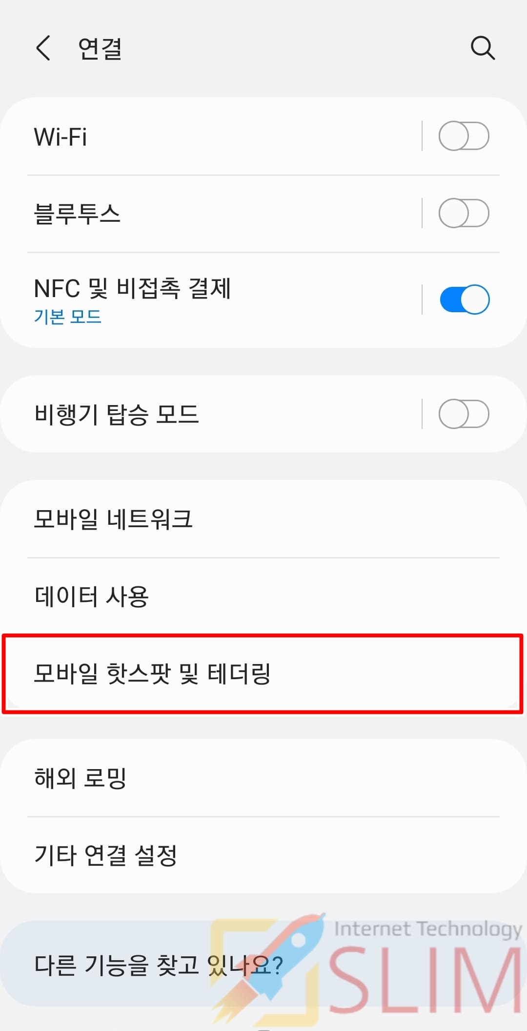 1. 갤럭시 설정 앱 > 연결 > 모바일 핫스팟 및 테더링 > 모바일 핫스팟을 클릭합니다.