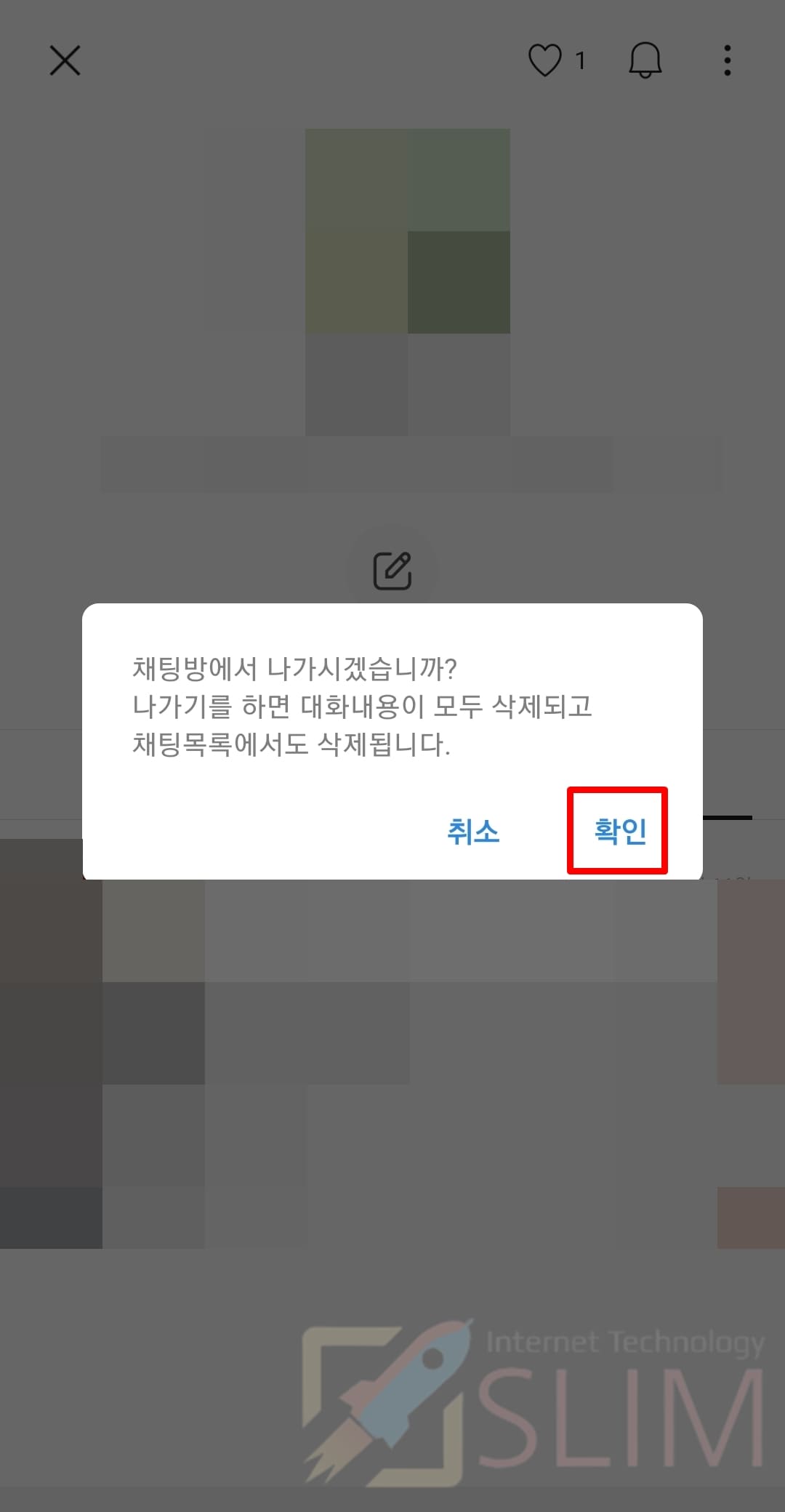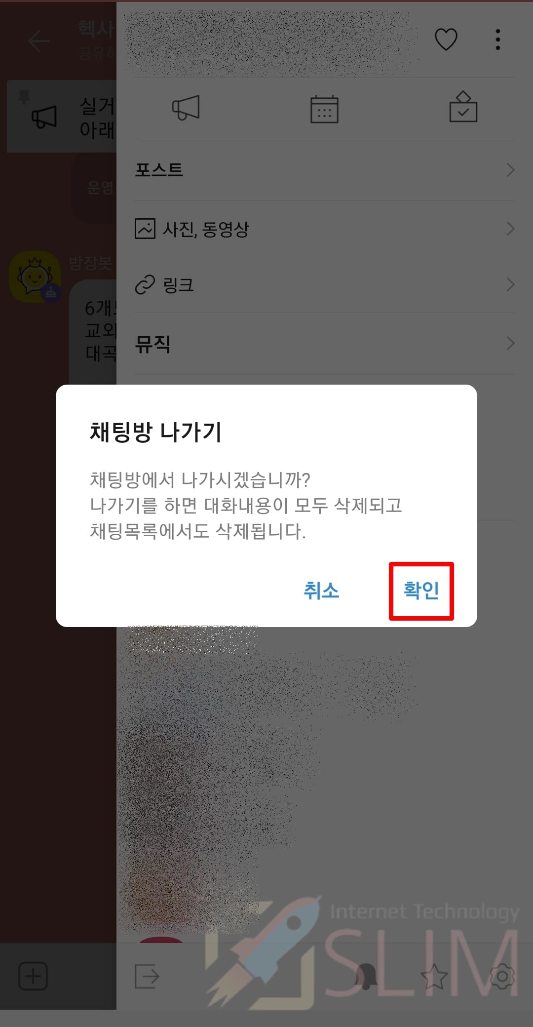 5. 채팅방 나가기 안내 창에서 확인을 누릅니다.