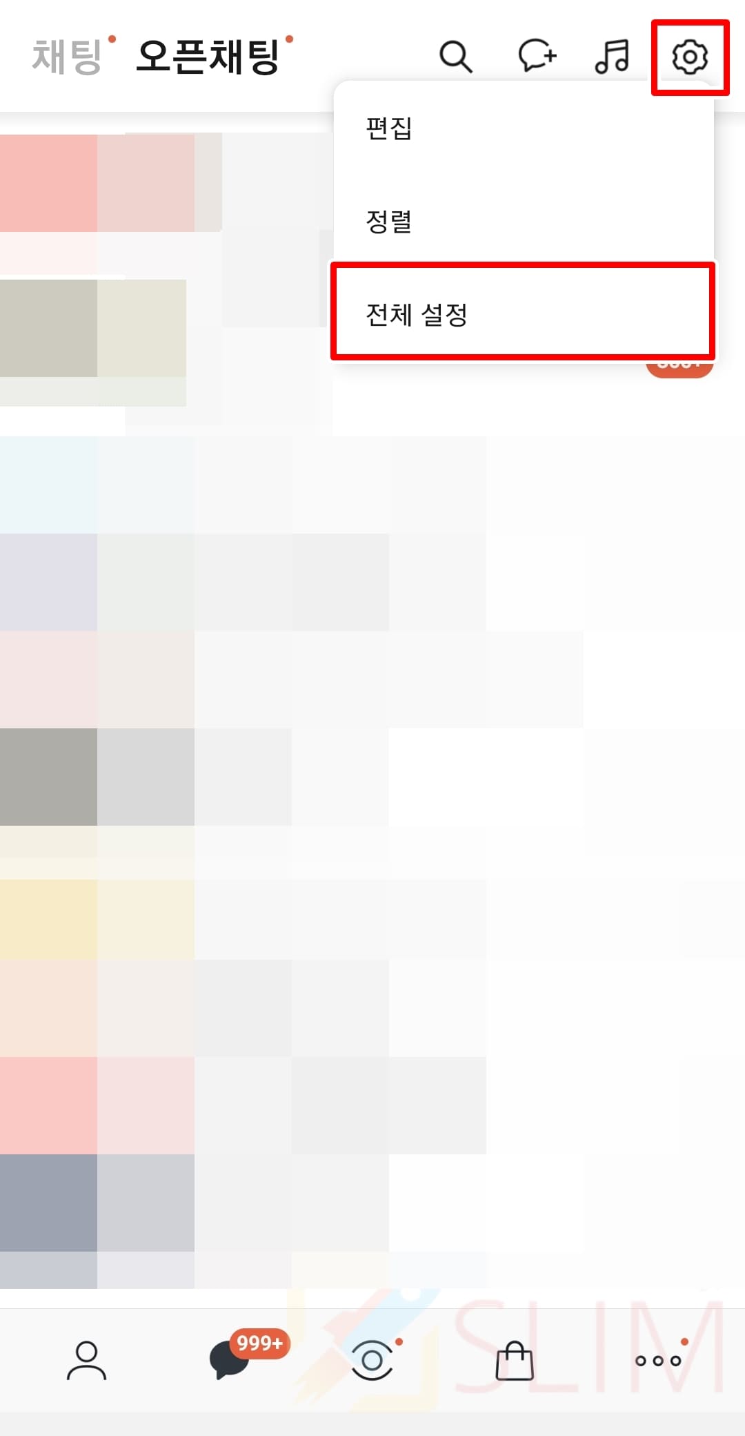 1. 카톡 앱의 우측 상단 톱니바퀴 버튼을 누릅니다.