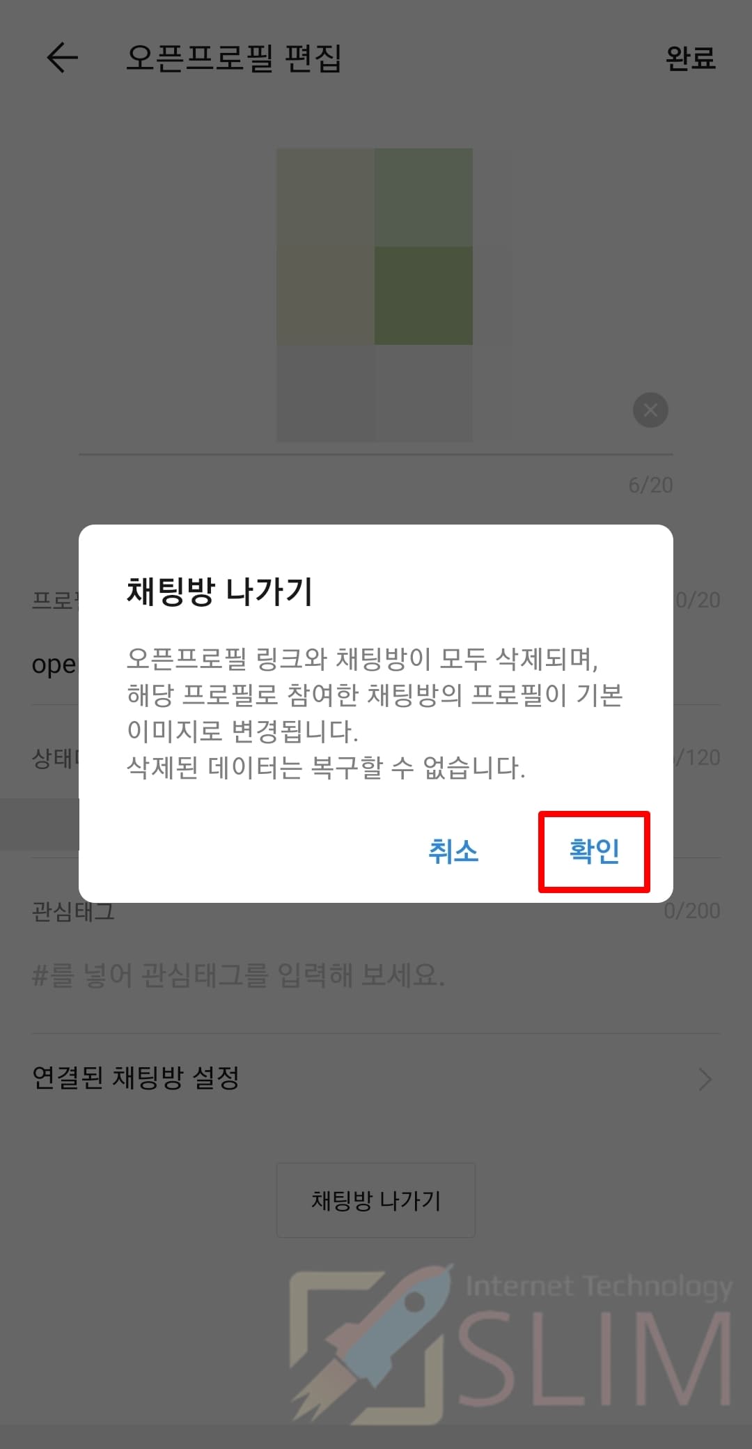 5. 확인을 누르면 오픈채팅방이 삭제됩니다.